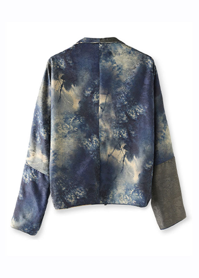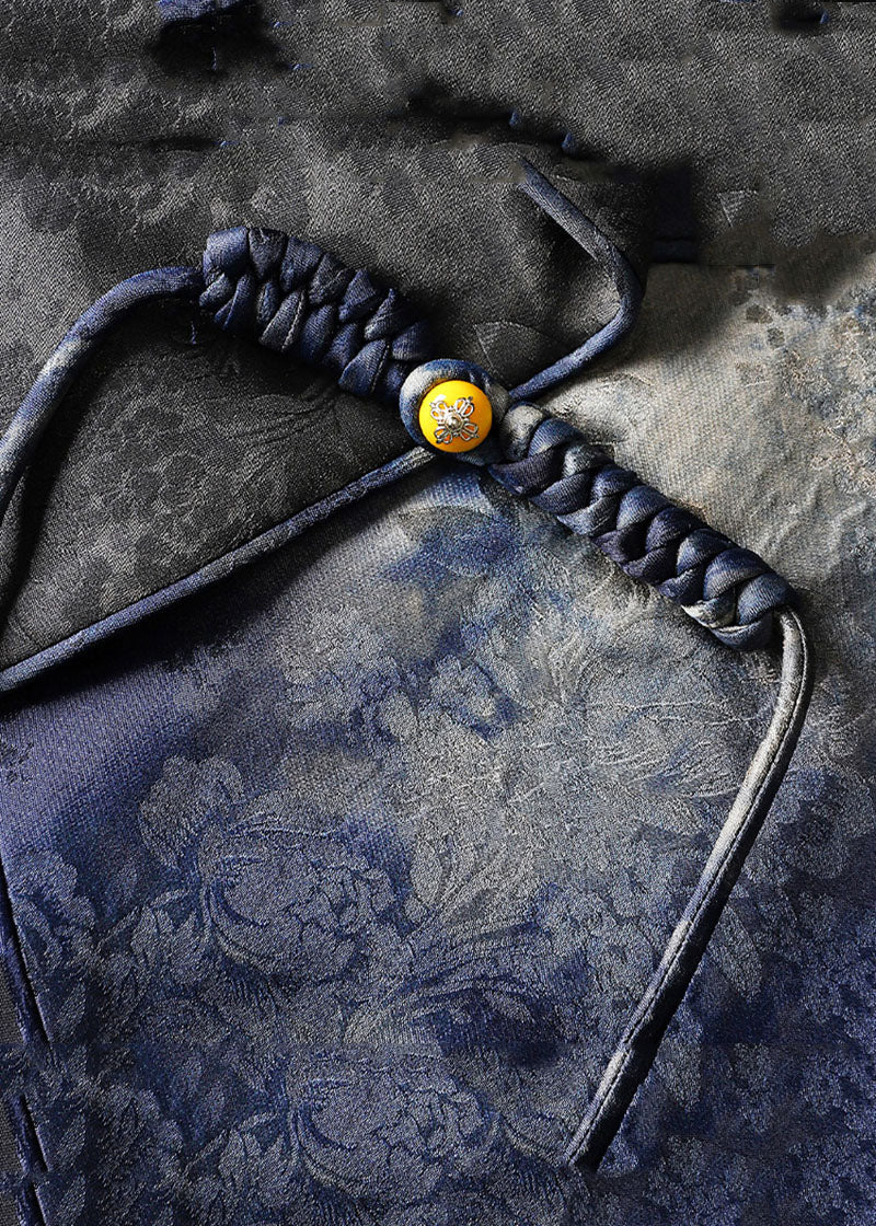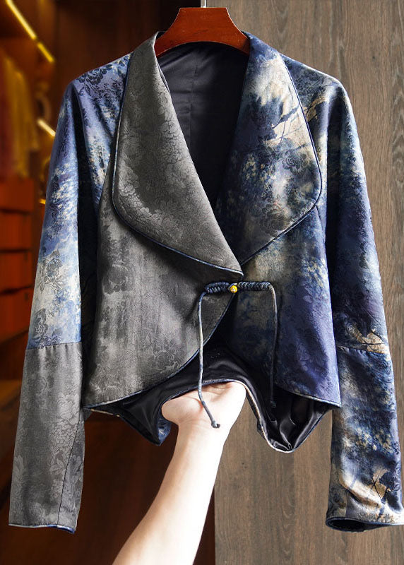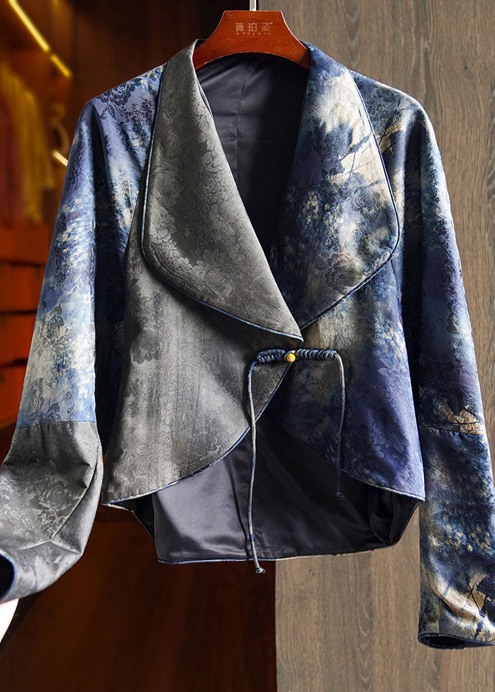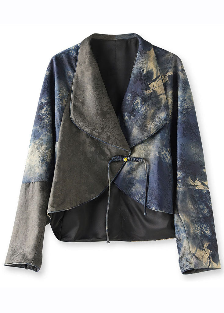 Retro Blue Notched Tassel Button Silk Coat Fall