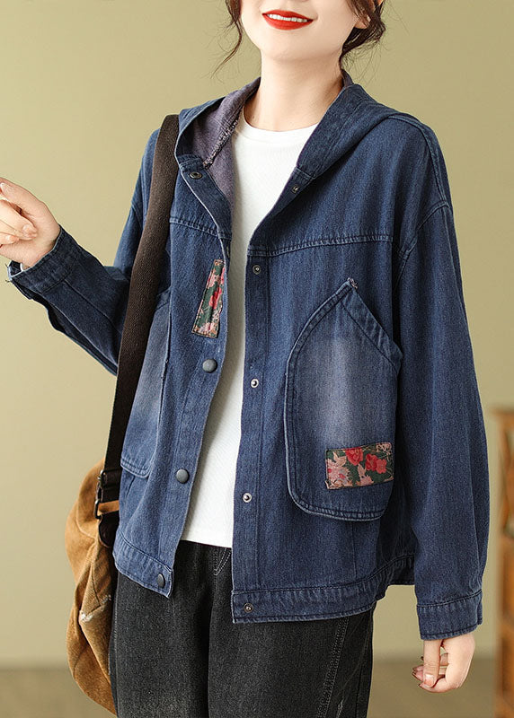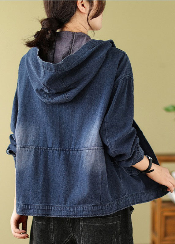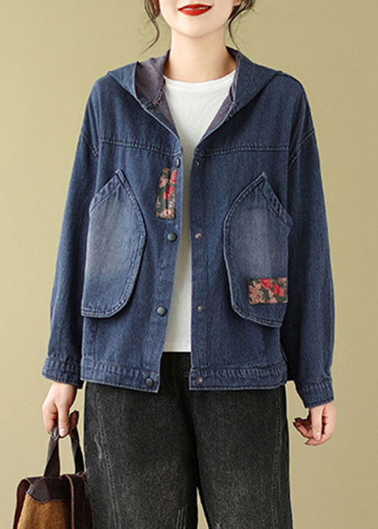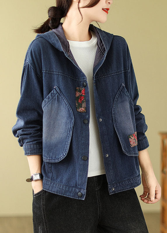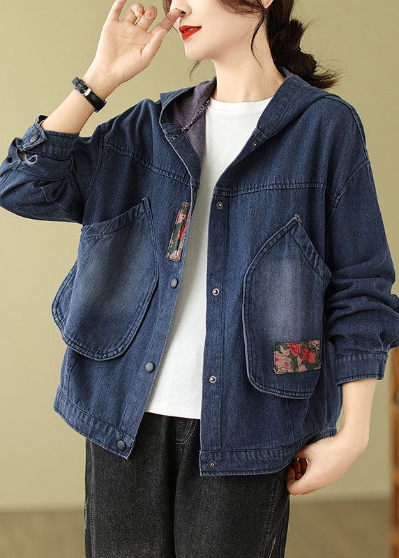 Retro Denim Blue Pockets Print Hooded Coats Fall