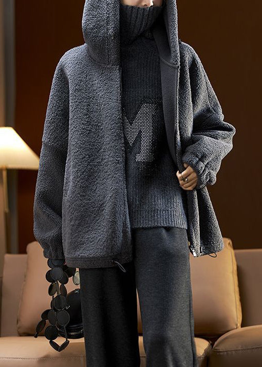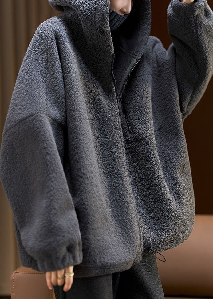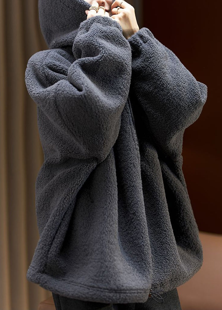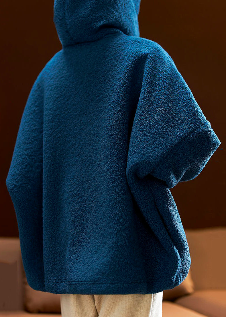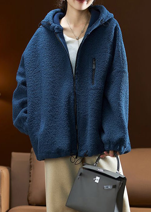 Simple Blue Hooded Pockets Drawstring Teddy Faux Fur Coats Long Sleeve