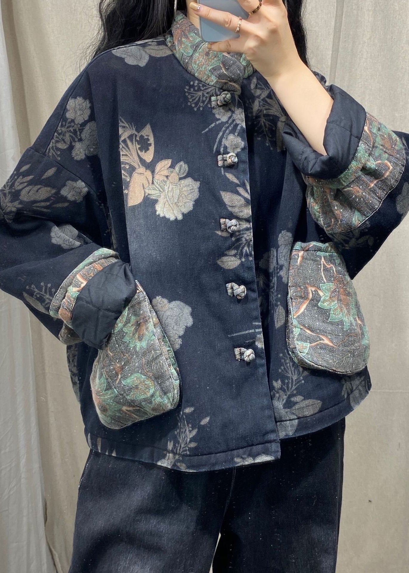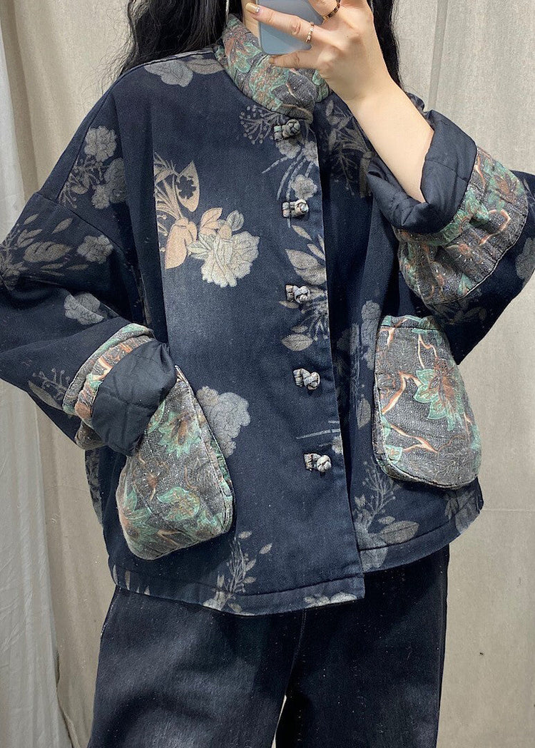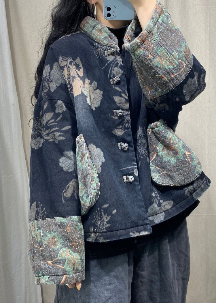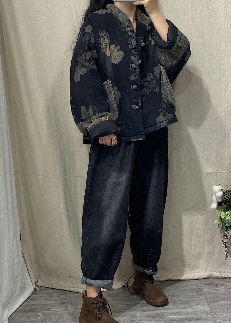 Vintage Black Mandarin Collar Print Fine Cotton Filled Witner Coat