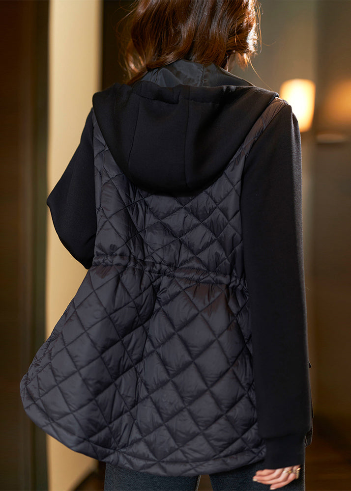Women Black Zippered Drawstring Patchwork Cotton Filled Coats Spring