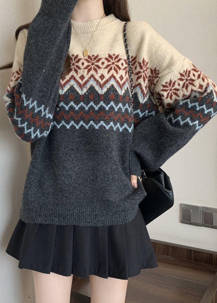 Loose Colorblock O Neck Jacquard Thick Knit Sweater Winter