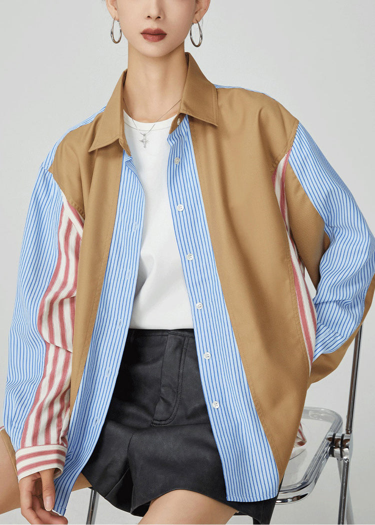 Striped Colorblock Peter Pan Collar Button Cotton Shirt Fall
