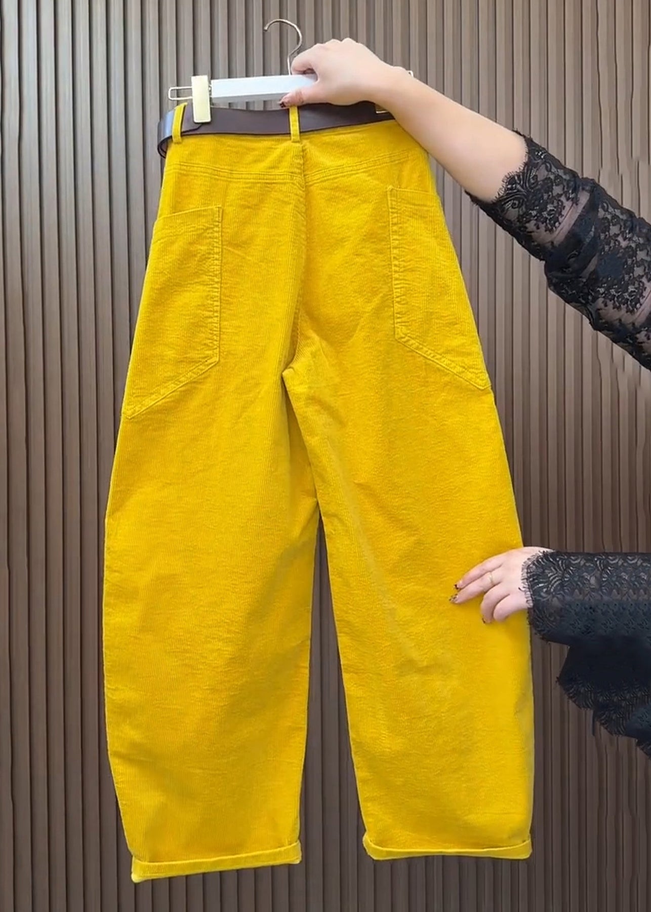 Plus Size Yellow Pockets High Waist Corduroy Wide Leg Pants Fall