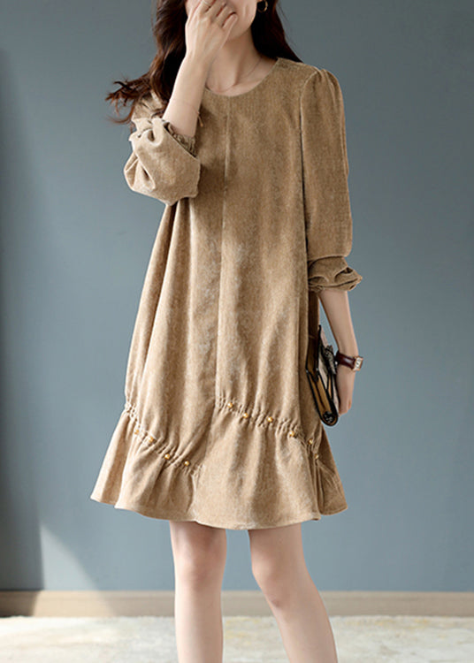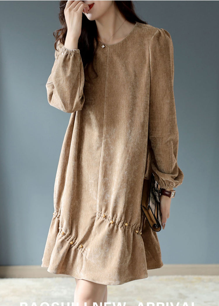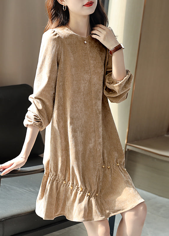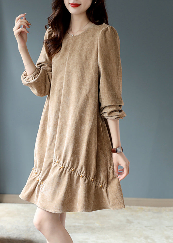 Casual Khaki Wrinkled Nail Bead Velour Mid Dresses Spring