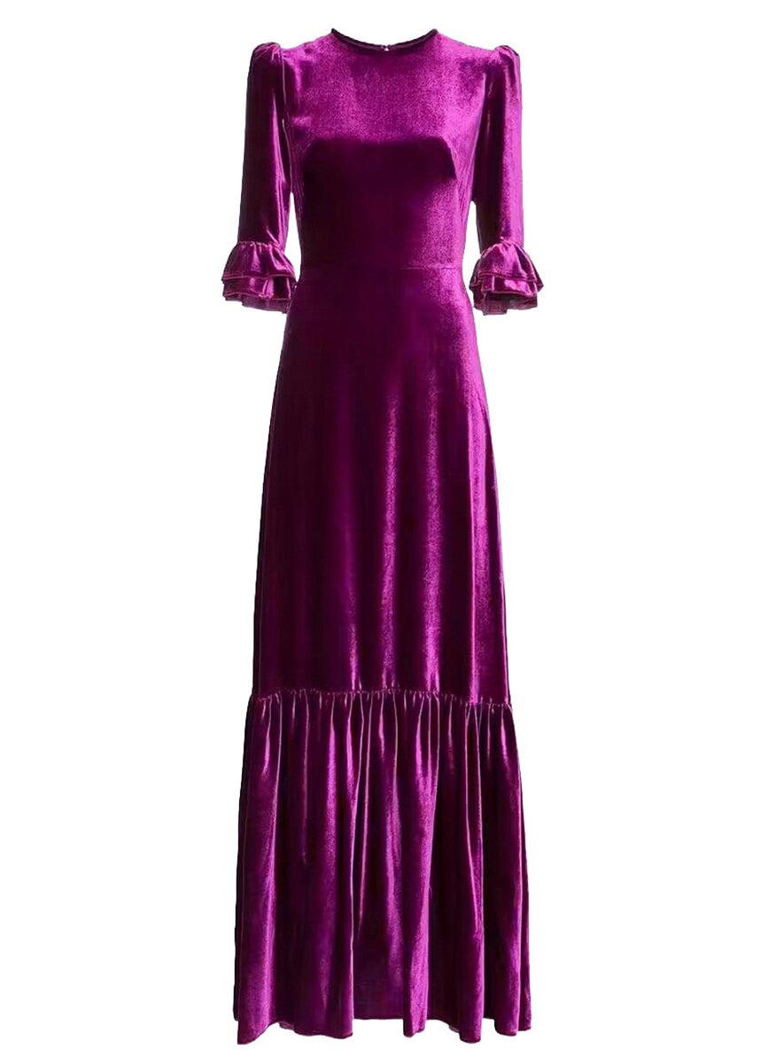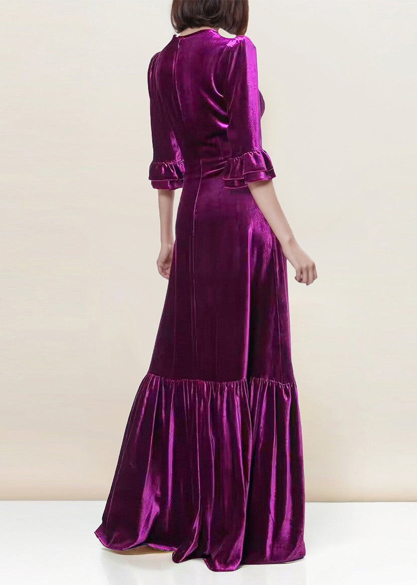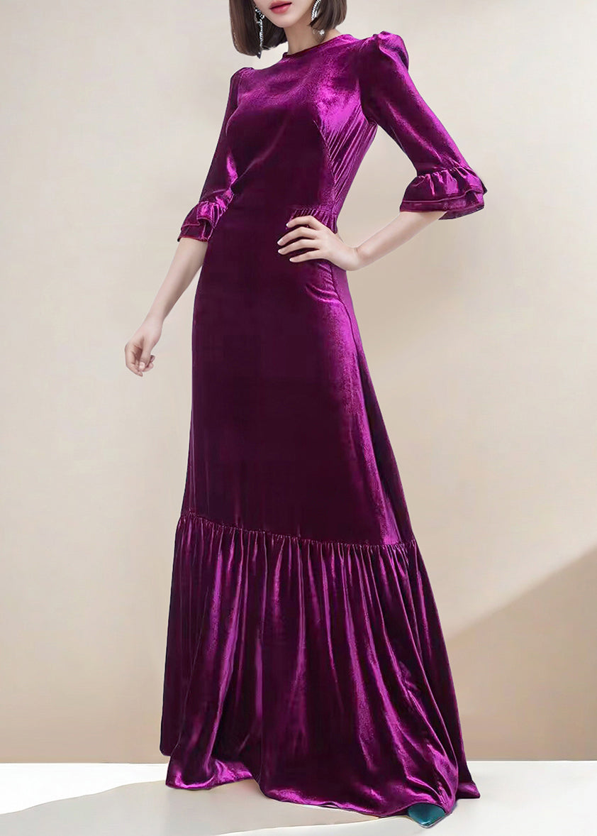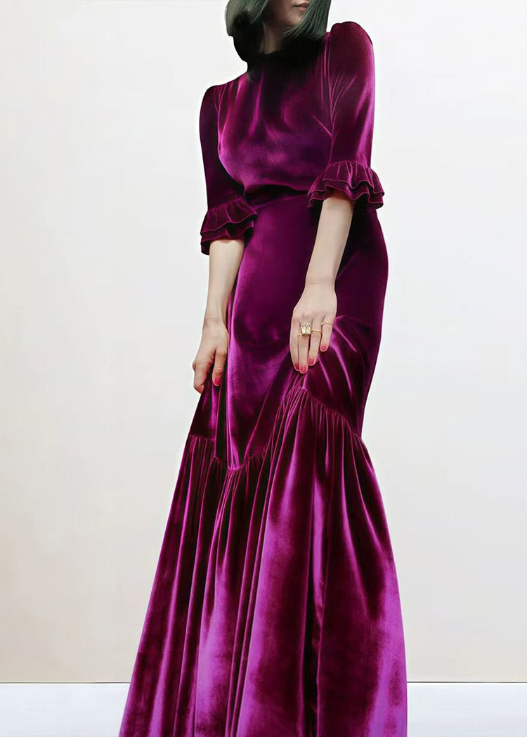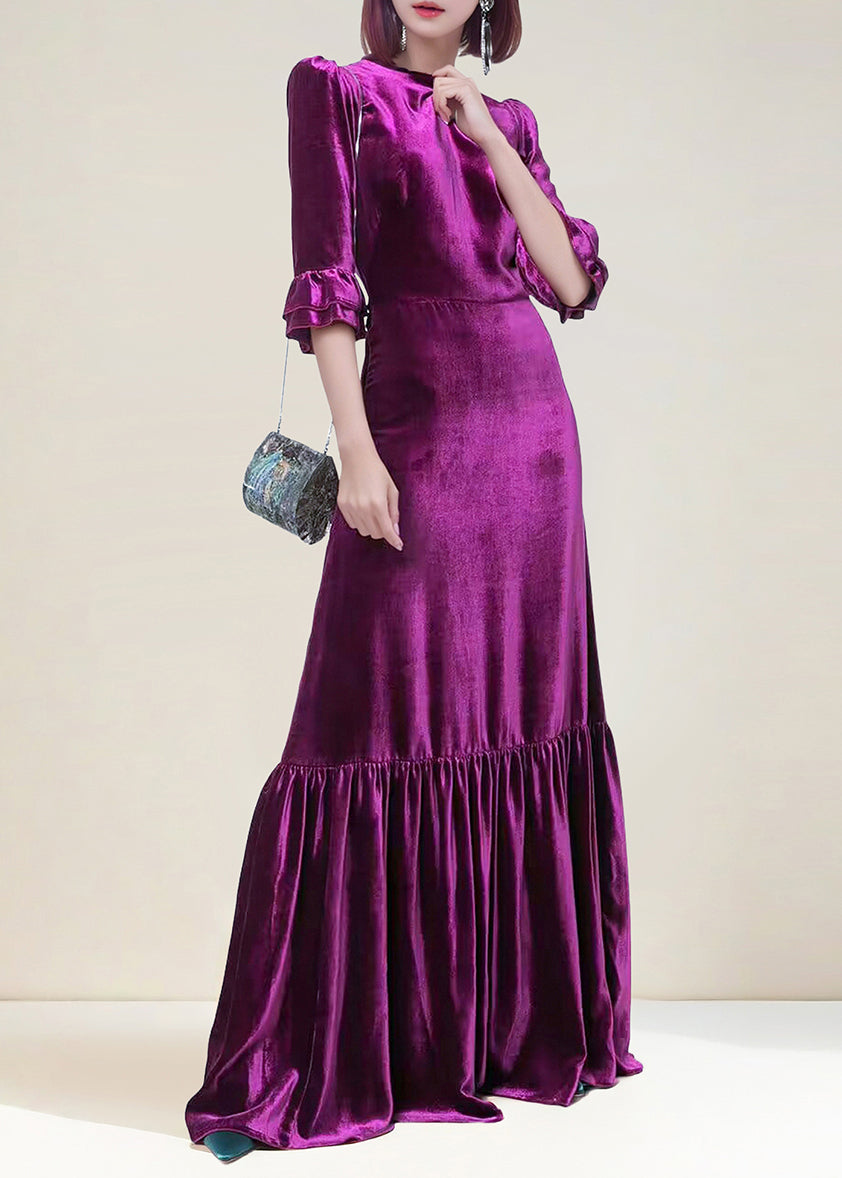 French Purple O Neck Ruffled Patchwork Silk Velvet Long Dresses Spring