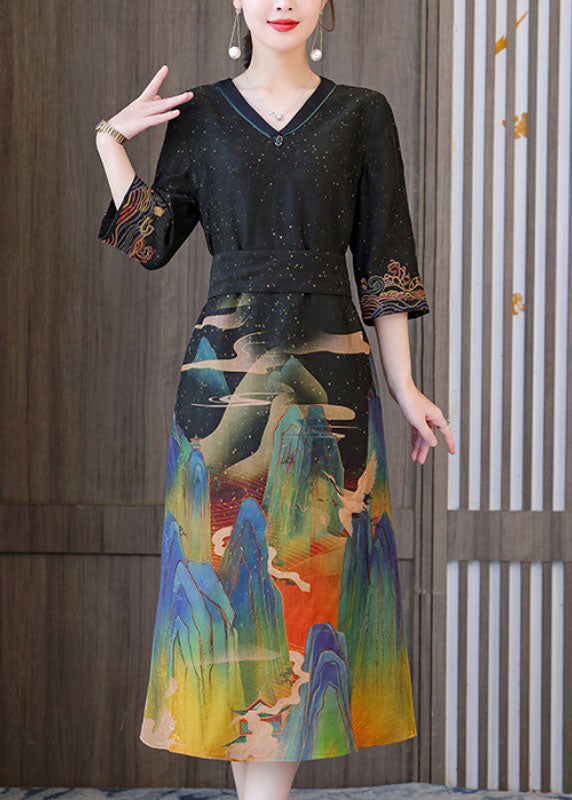 Women Black V Neck Embroideried Print Silk Long Dresses Half Sleeve