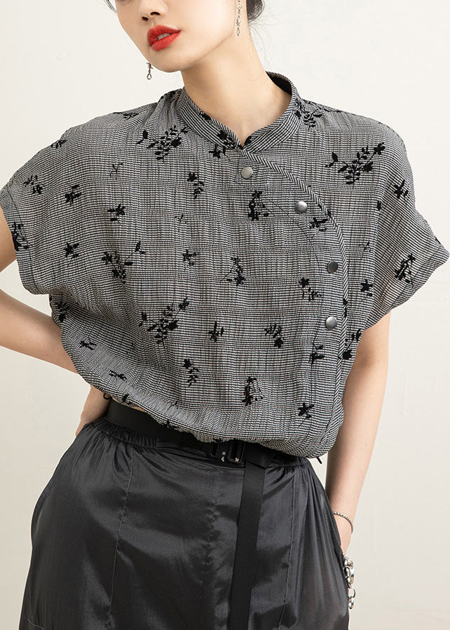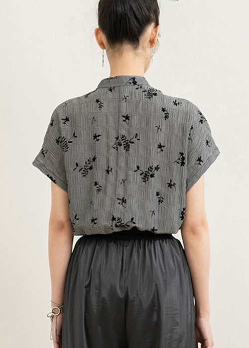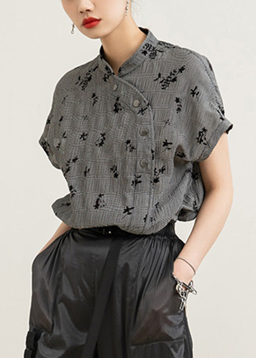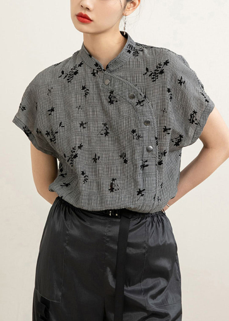 New Grey Stand Collar Button Print Cotton T Shirt Half Sleeve