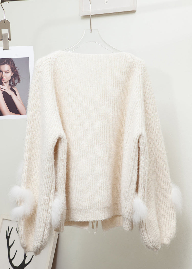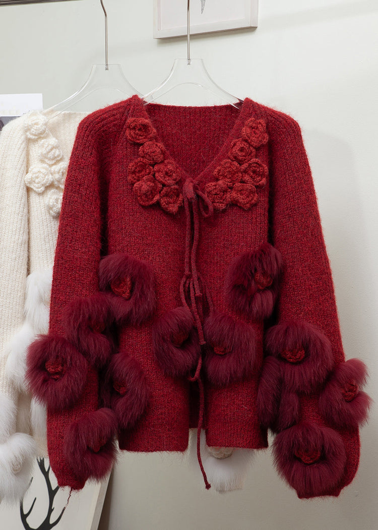 Floral Beige Lace Up Fox Fur Patchwork Knit Coats Winter