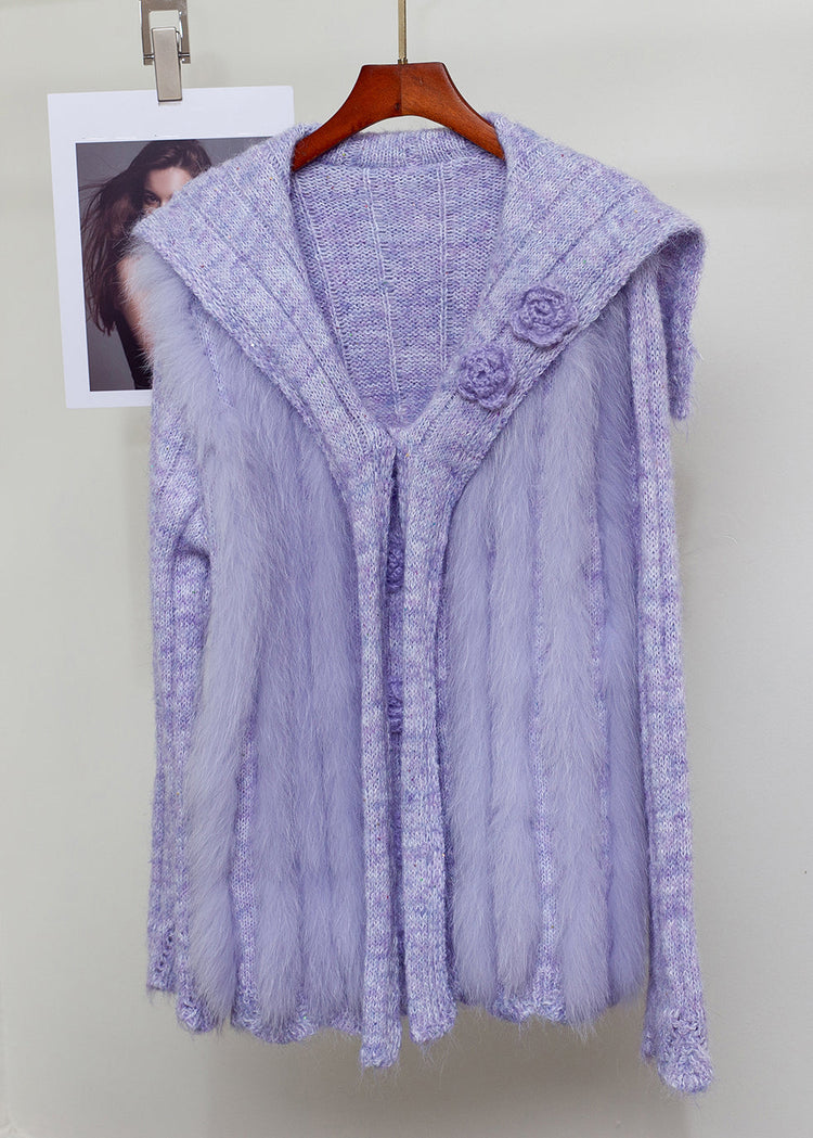 French Purple Sailor Collar Fox Fur Patchwork Knit Sweaters Winter