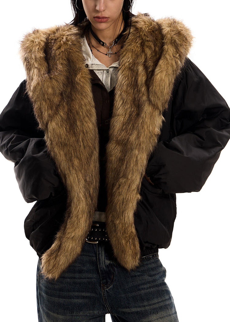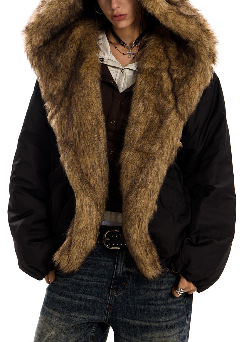 Italian Black Hooded Patchwork Faux Fur Cotton Filled Coat Winter