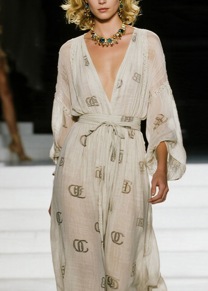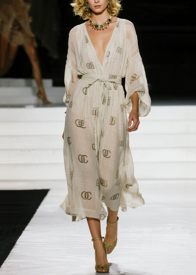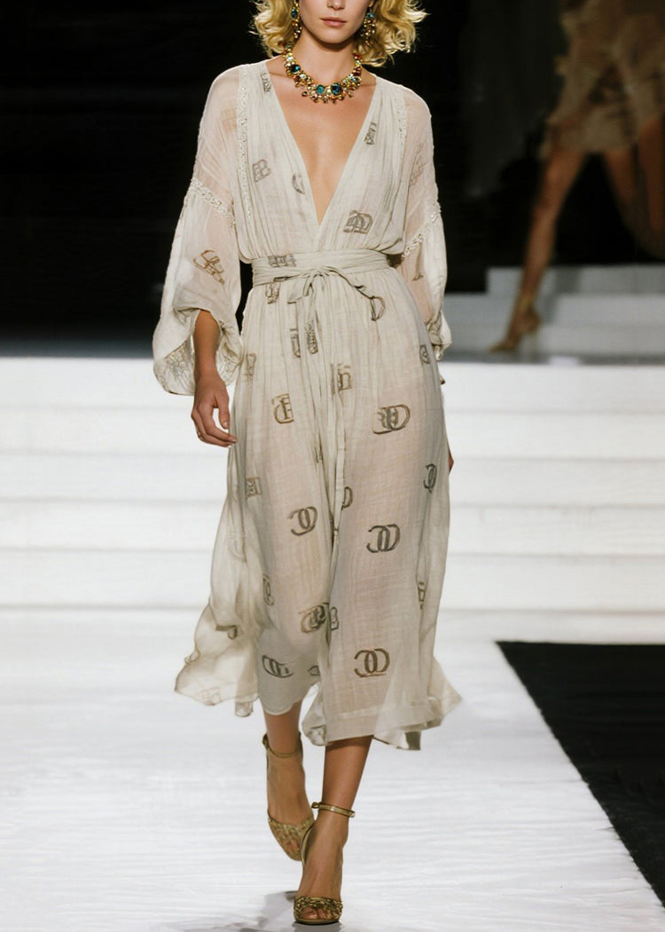 Italian V Neck Print Lace Up Cotton Dresses Fall