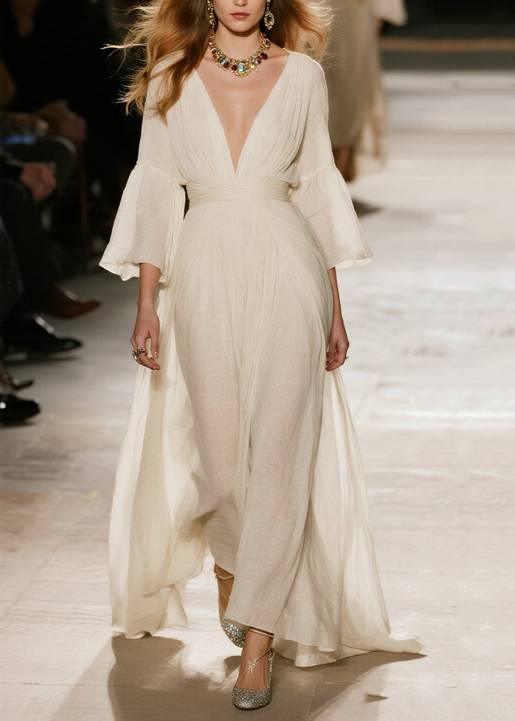 Natural Beige V Neck Patchwork Cotton Maxi Dresses Fall