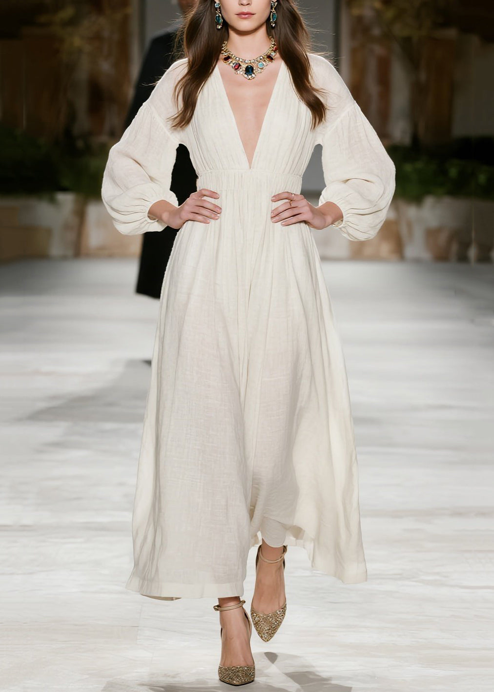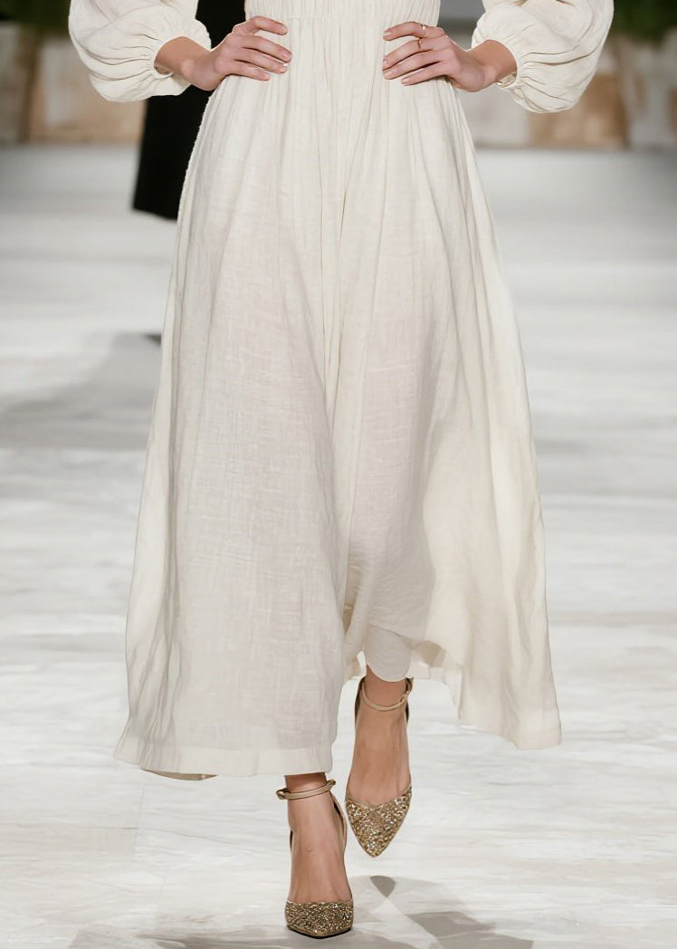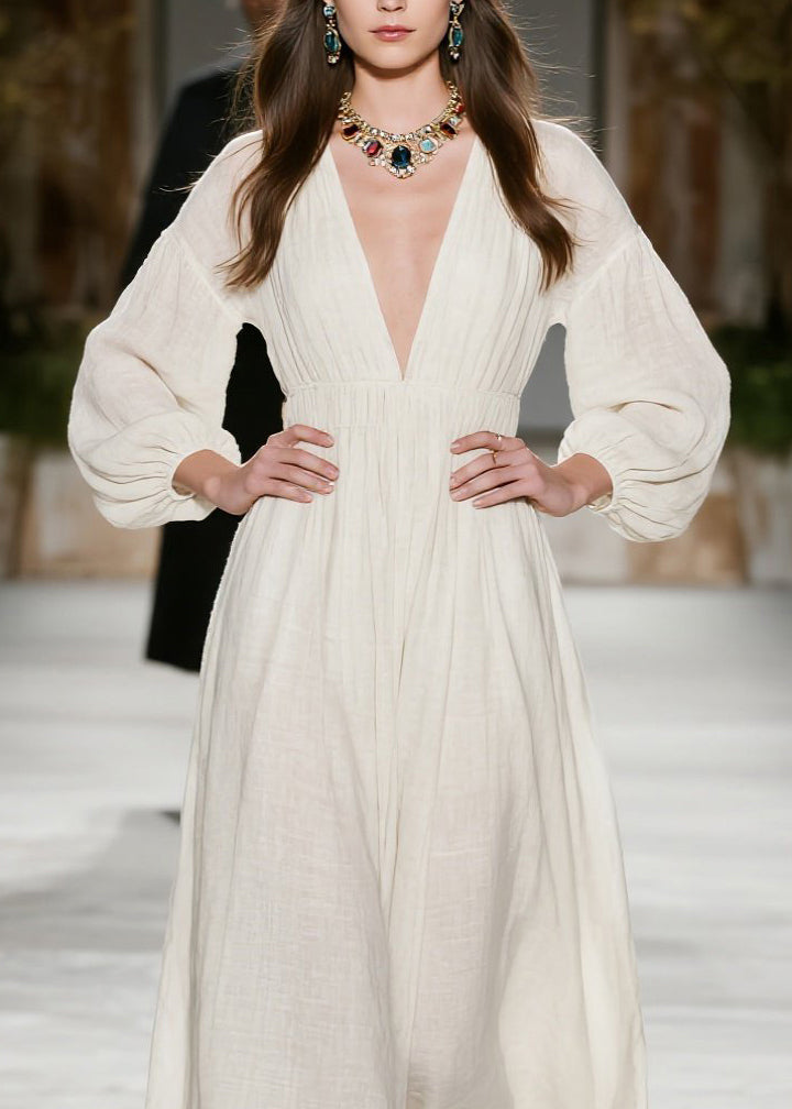 New Beige V Neck Wrinkled Patchwork Cotton Dress Fall