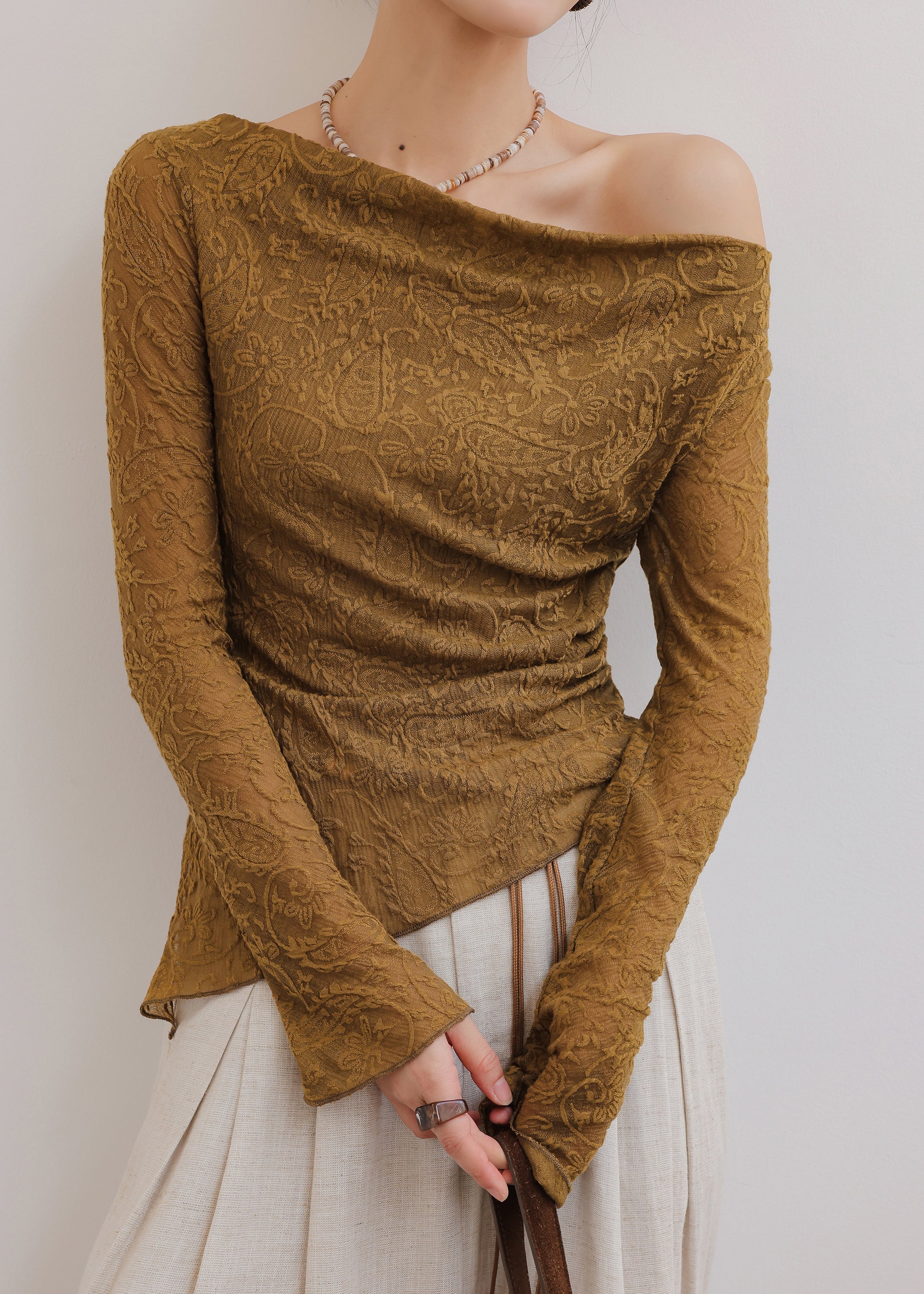 Beautiful Brown Asymmetrical Jacquard Cotton Top Flare Sleeve