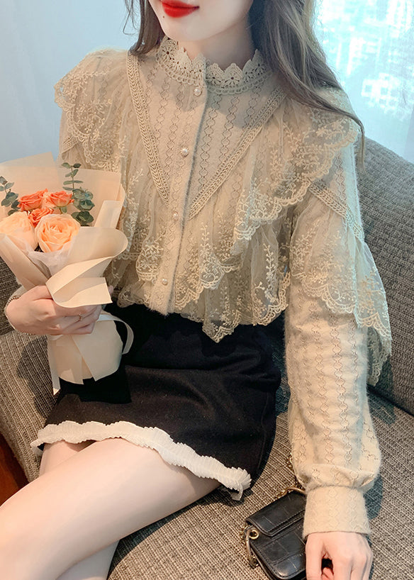 Apricot Button Original Design Patchwork Lace Shirt Stand Collar