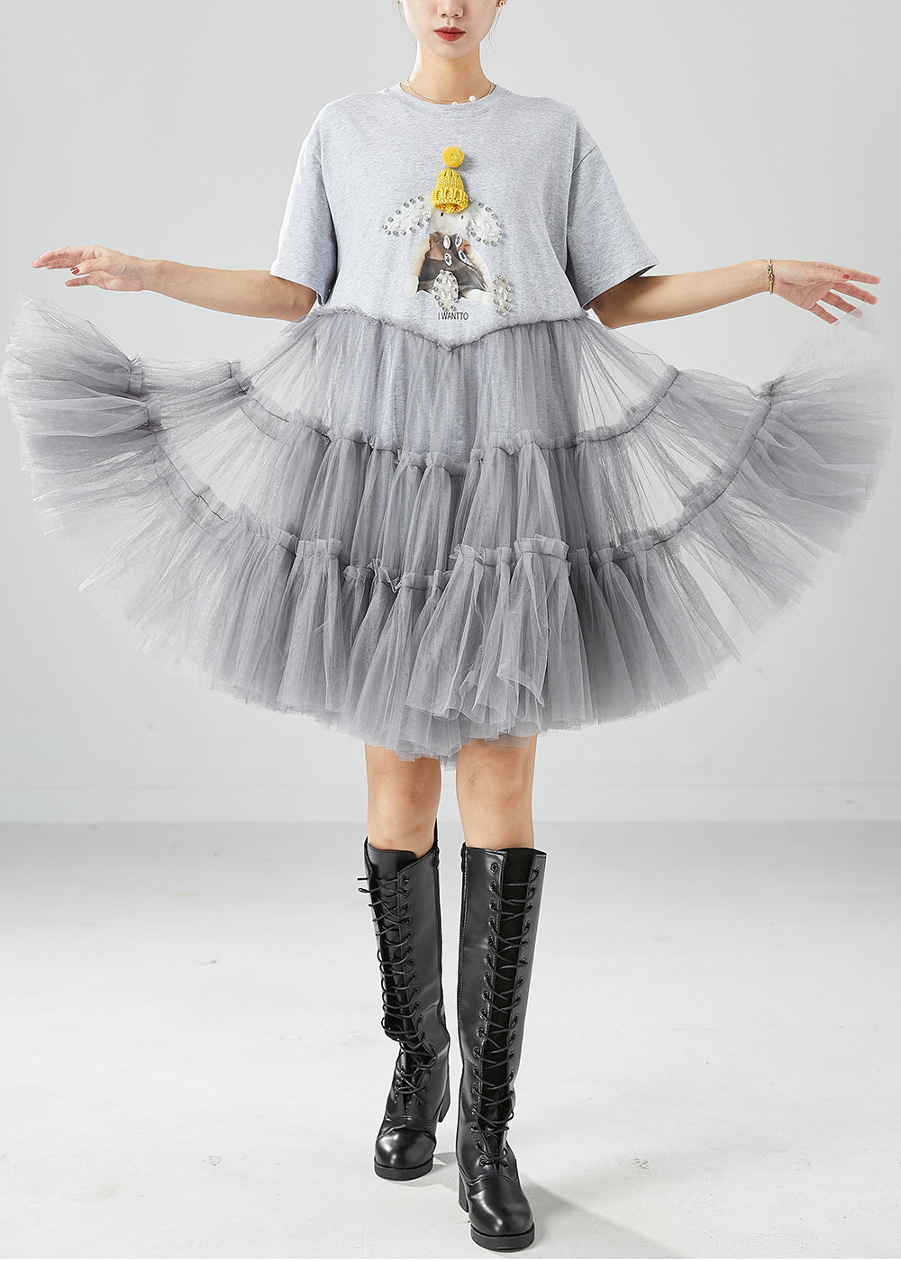 Art Grey Ruffled Solid Tulle Patchwork Knit Dress