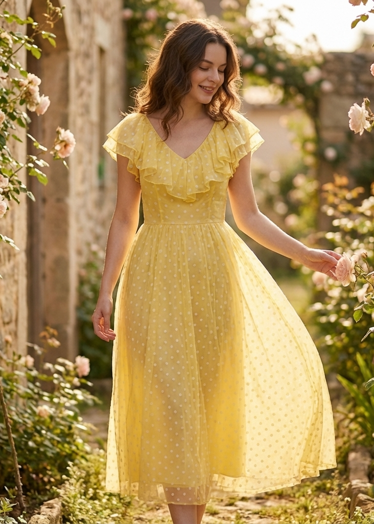 Stylish Yellow V Neck Ruffled Print Chiffon Long Dress Summer