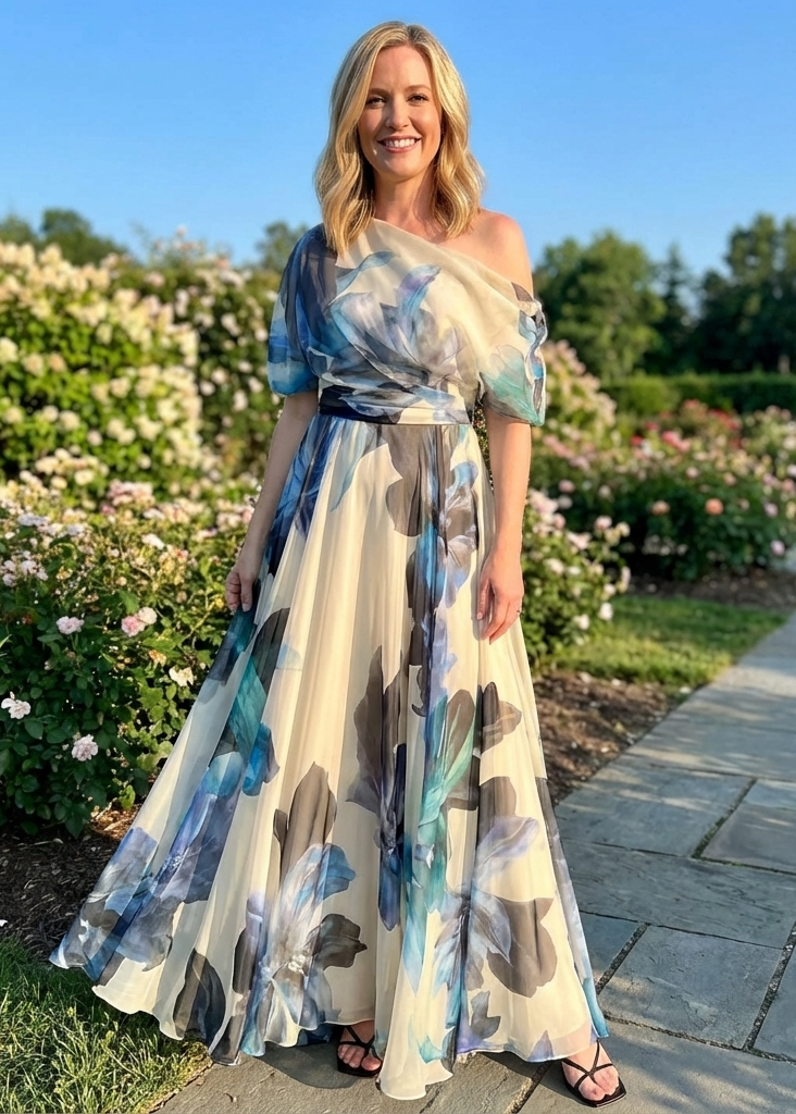 French Sky Blue Asymmetrical Print Chiffon Long Dresses Summer