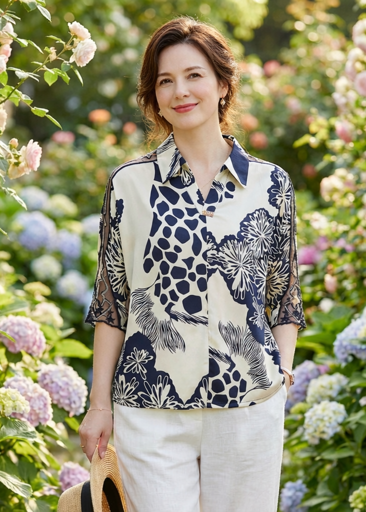 Loose Navy Peter Pan Collar Print Chiffon Blouses Bracelet Sleeve