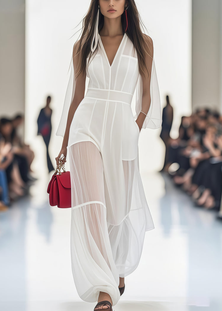 Stylish White V Neck Patchwork Tulle Silm Fit Jumpsuits Summer
