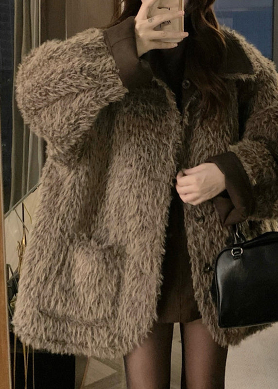 Vintage Coffee Peter Pan Collar Button Wear On Both Sides Thick Leather And Fur Coats Winter