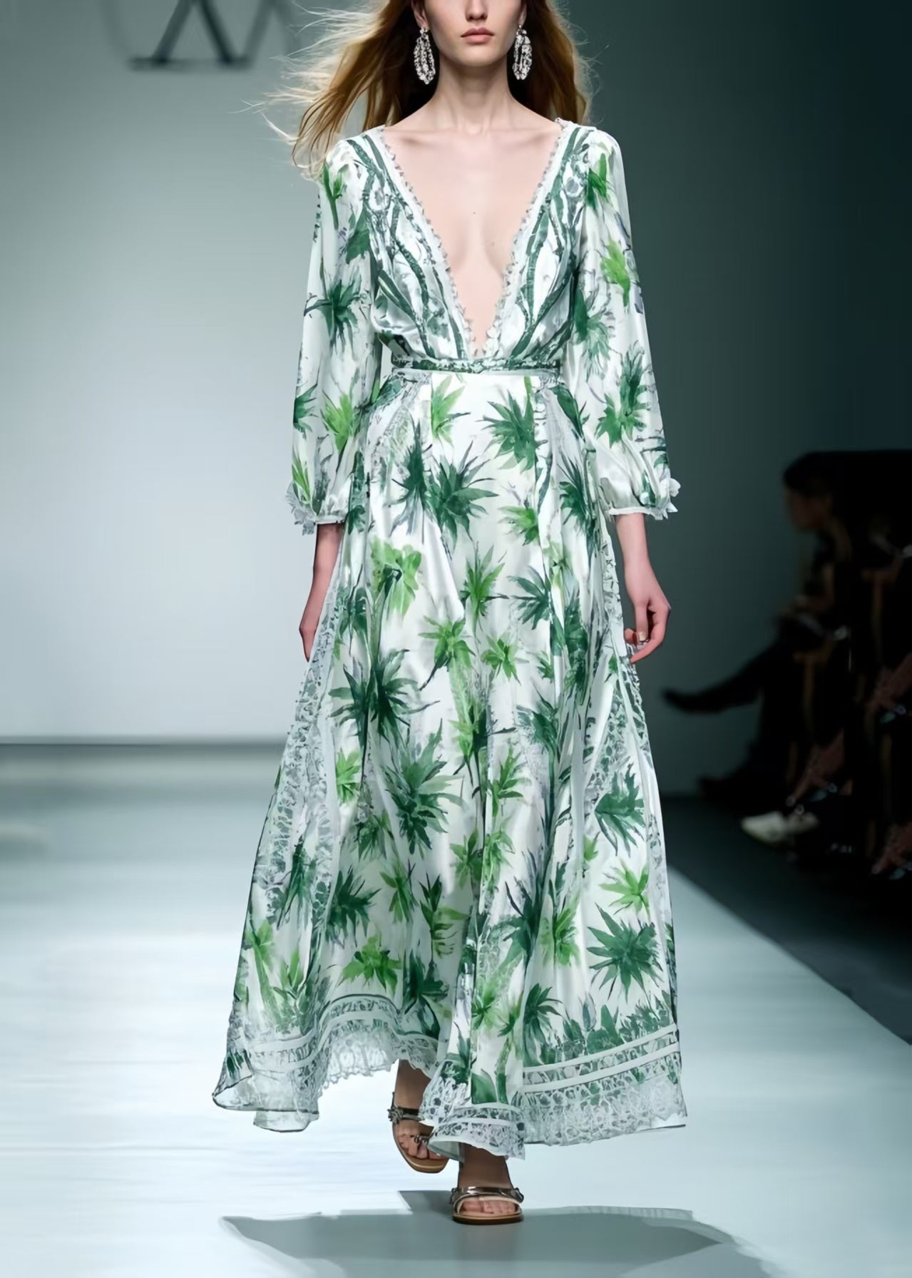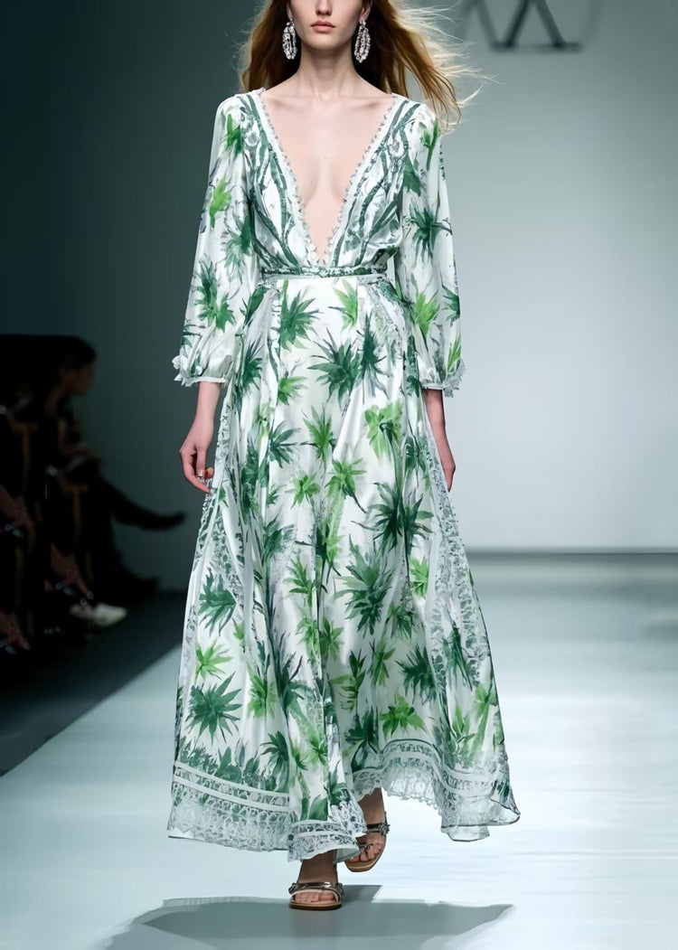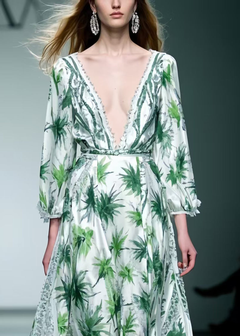 Italian Green Leaf Print Exra Large Hem Silk Dress Bracelet Sleeve