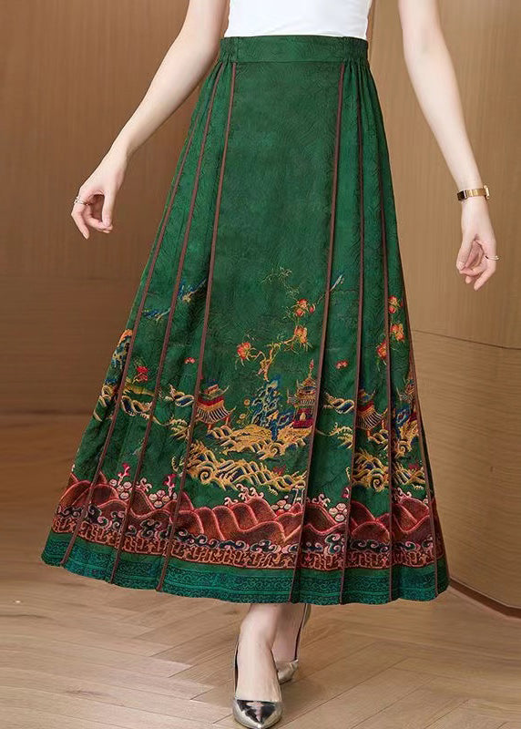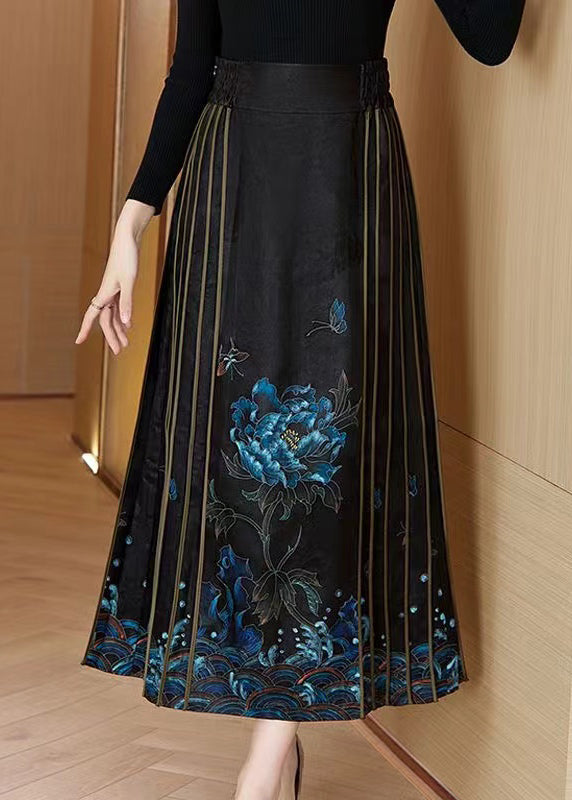 Vintage Blue Print Wrinkled High Waist Silk Skirt Spring
