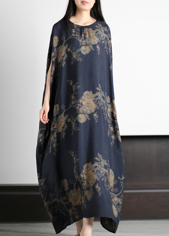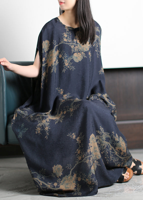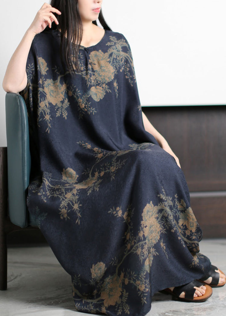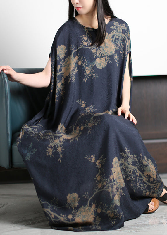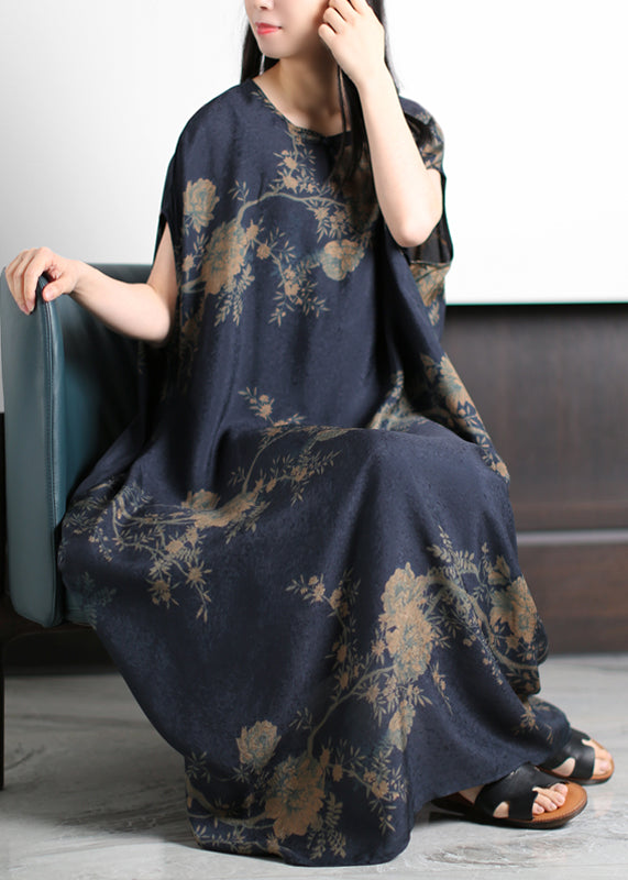 Beautiful Dark Blue O-Neck Print Silk Holiday Dress Short Sleeve
