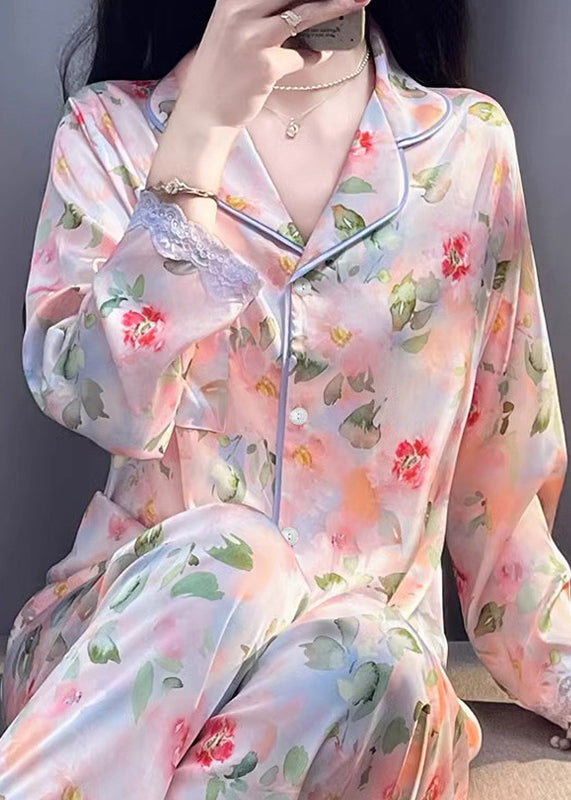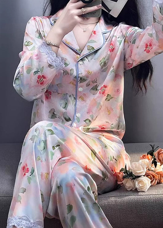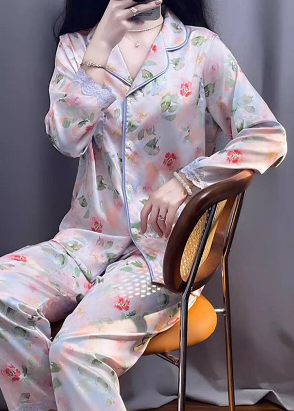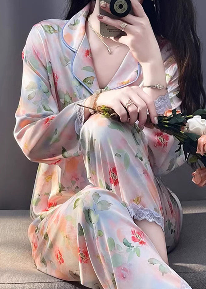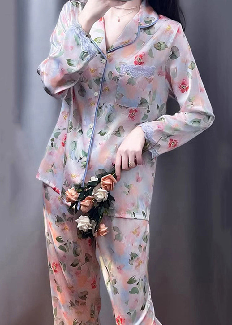 Beautiful Photo Color Print Pockets Lace Silk Pajamas Two Pieces Set Spring