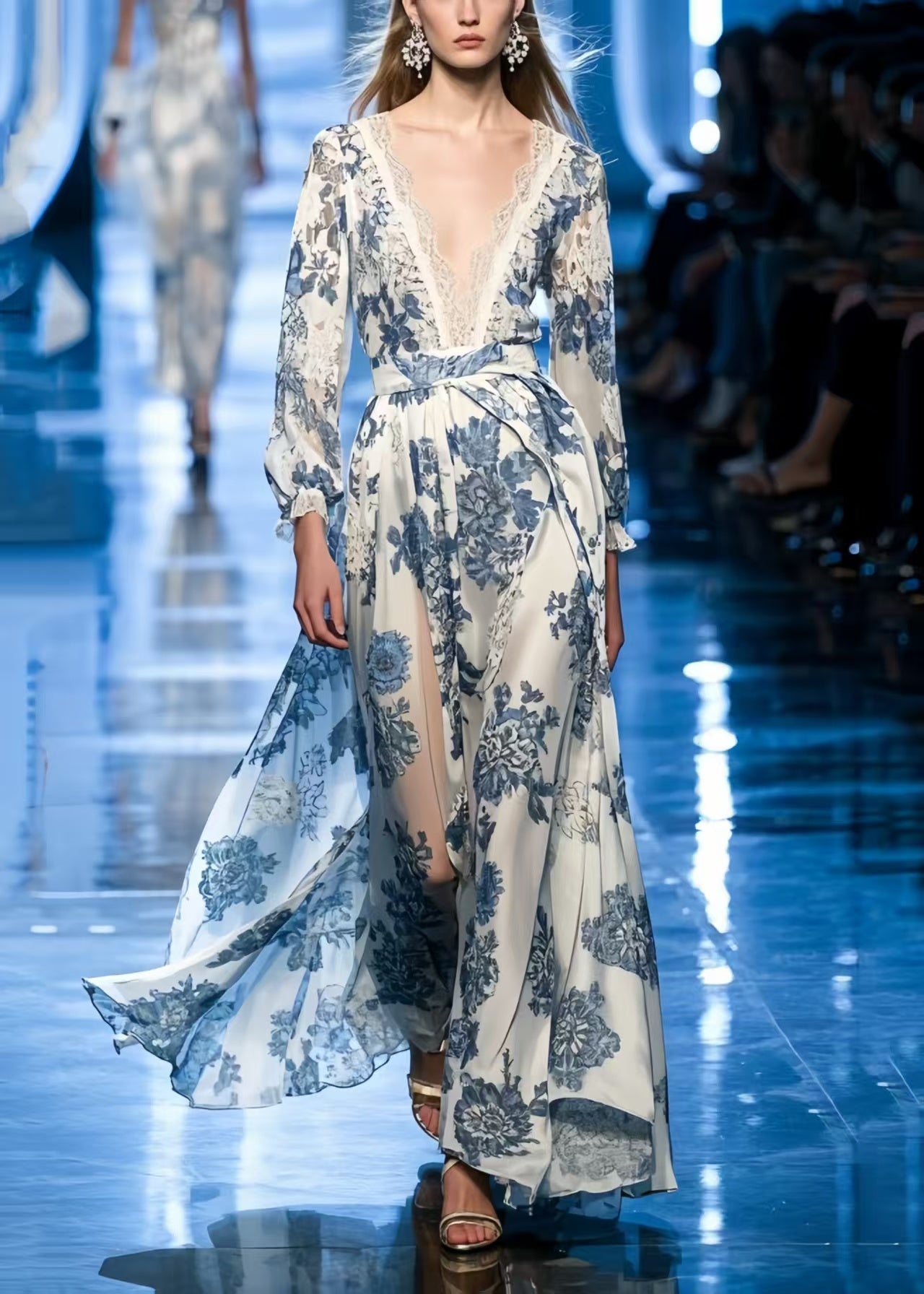 Bohemian Blue Print Draping Silk Vacation Dresses Summer