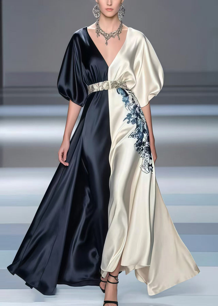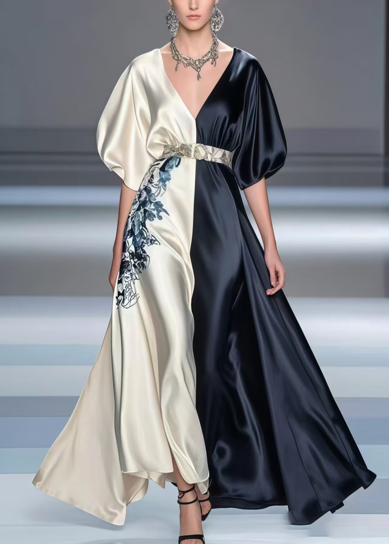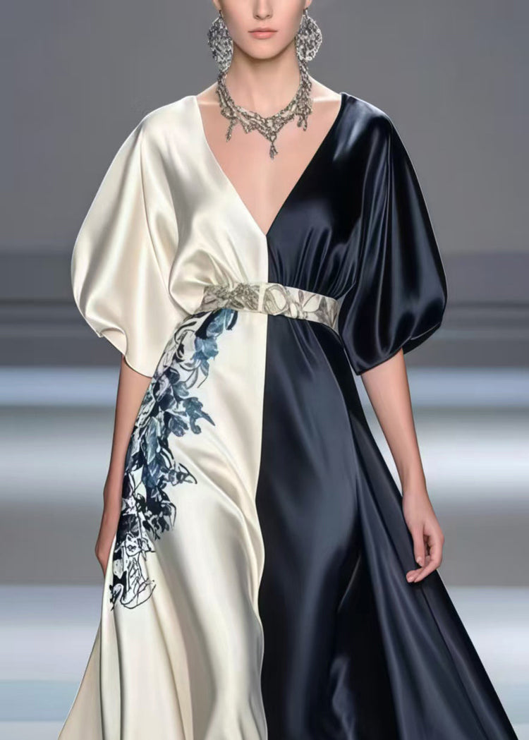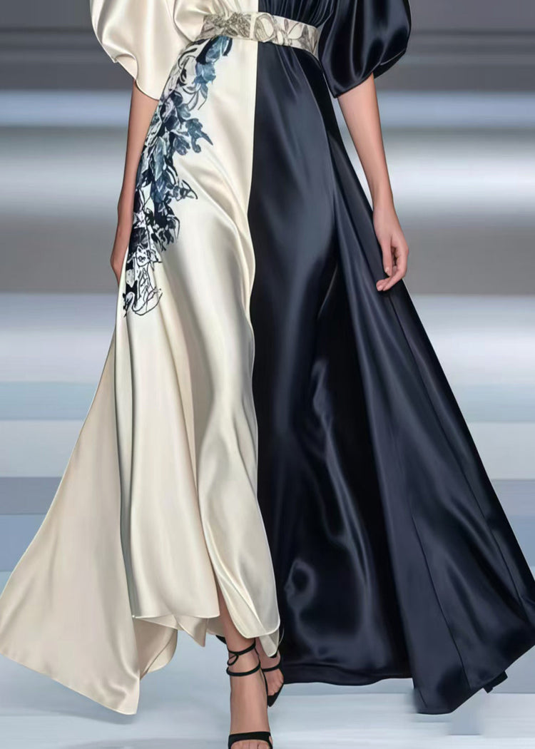 Casual Colorblock Puff Sleeve Patchwork Silk Tunic Dresses Summer