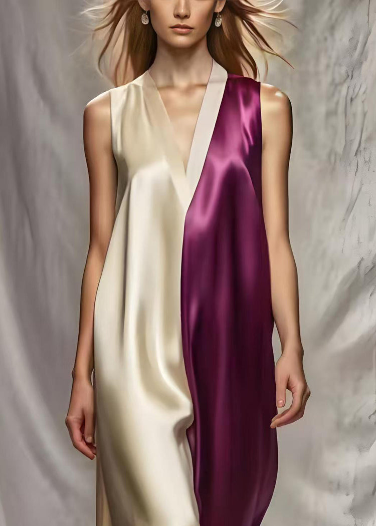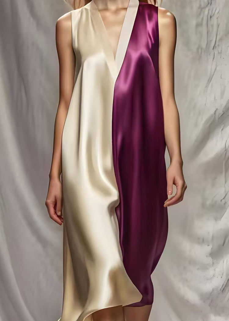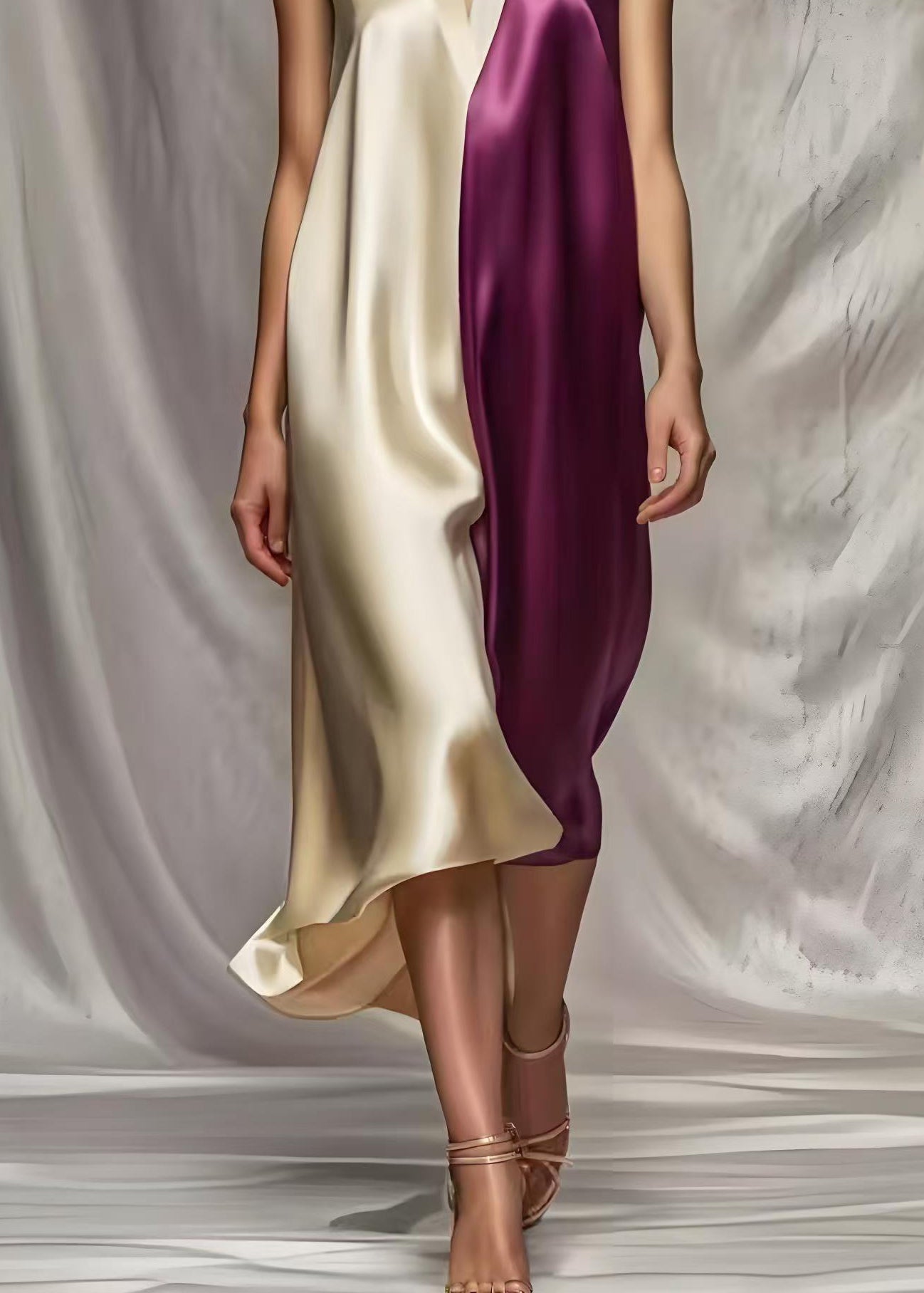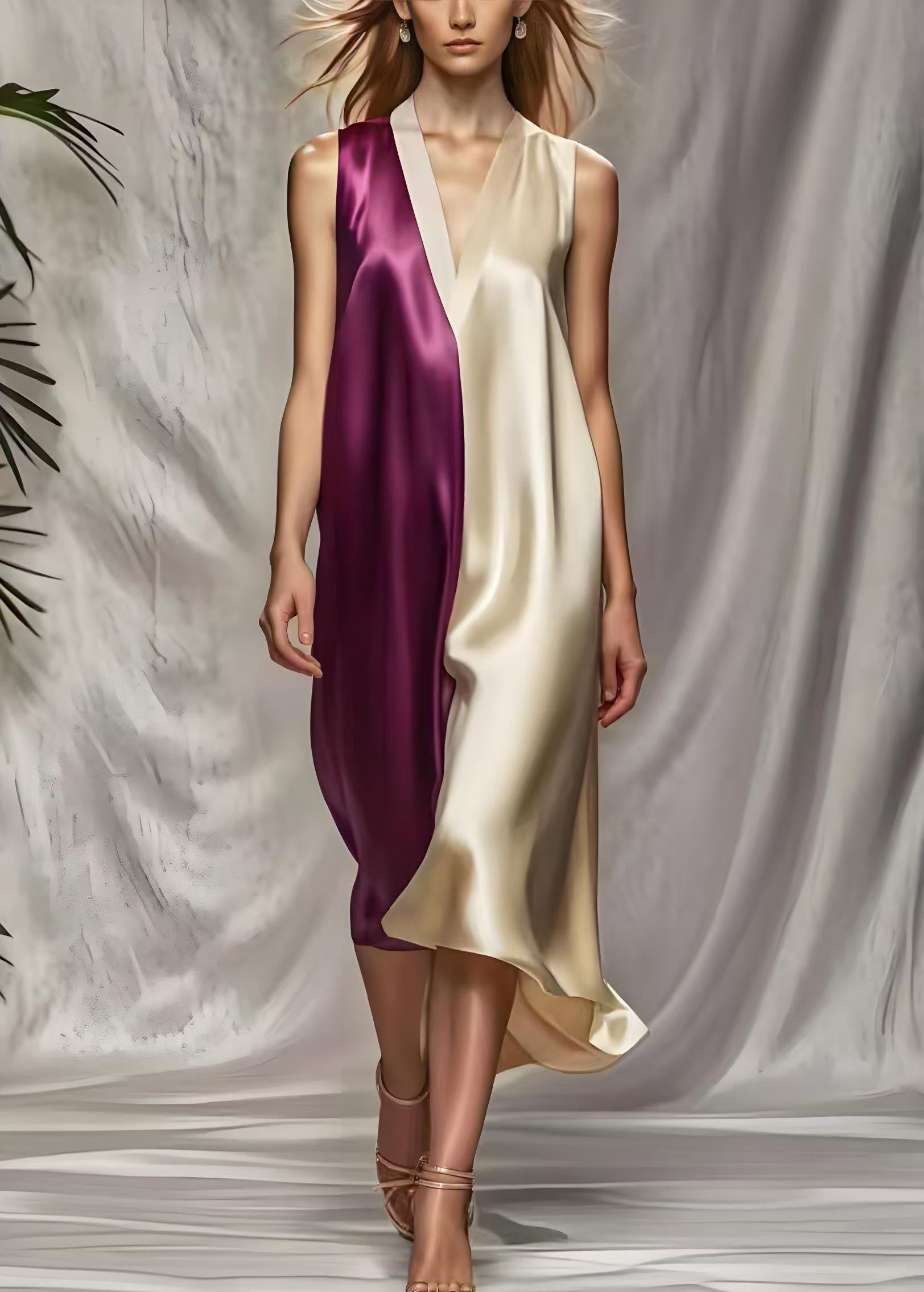 Casual Colorblock V Neck Patchwork Silk Beach Dress Summer