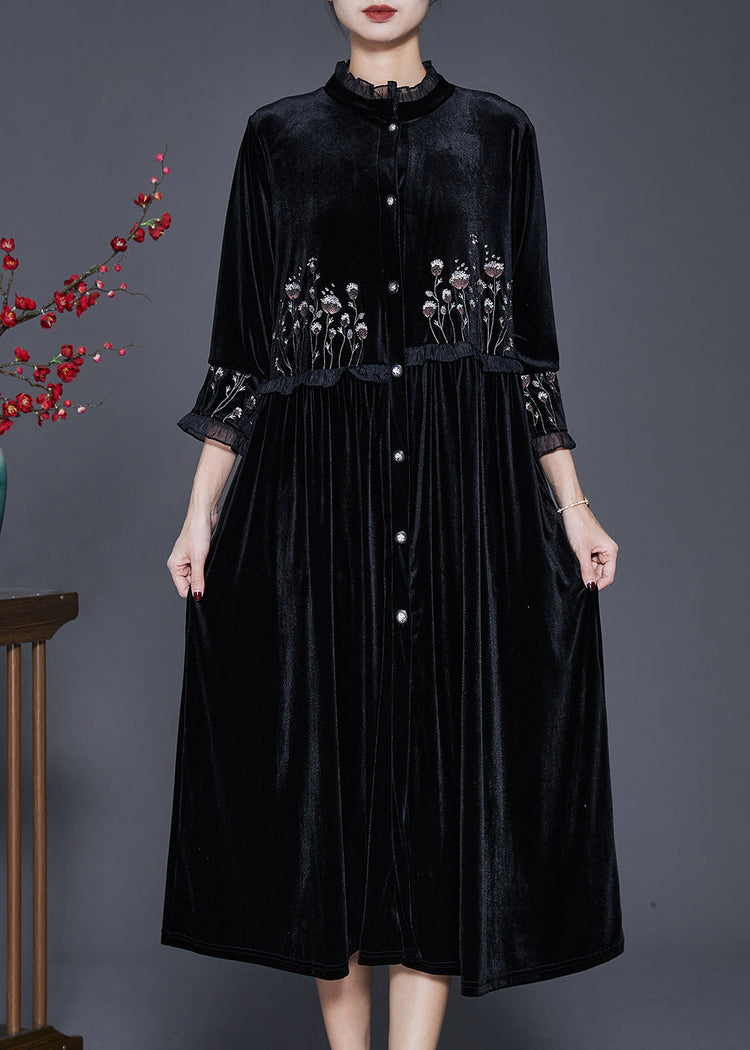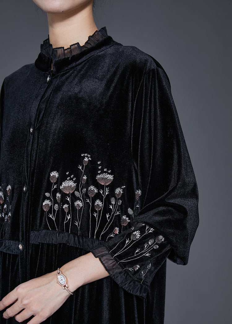 Chic Black Embroidered Patchwork Ruffled Silk Velvet Dress Bracelet Sleeve