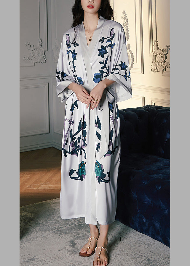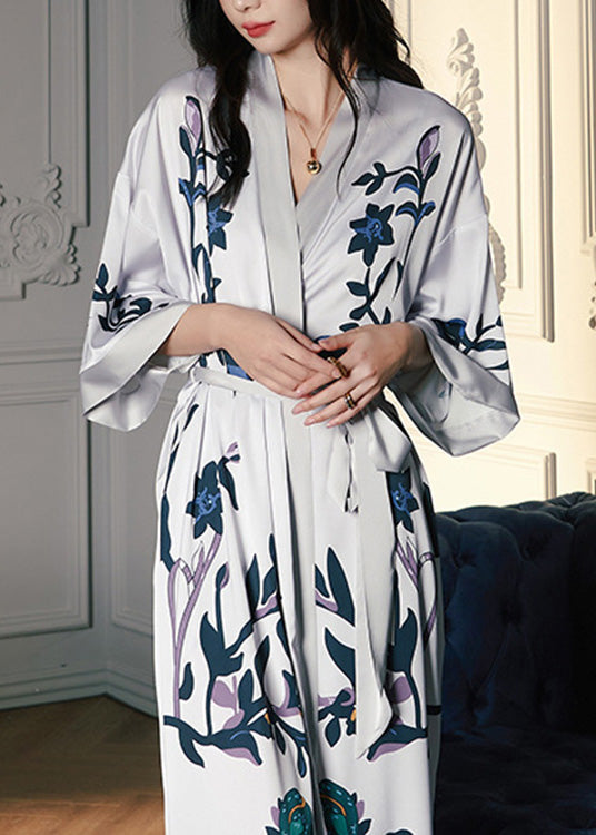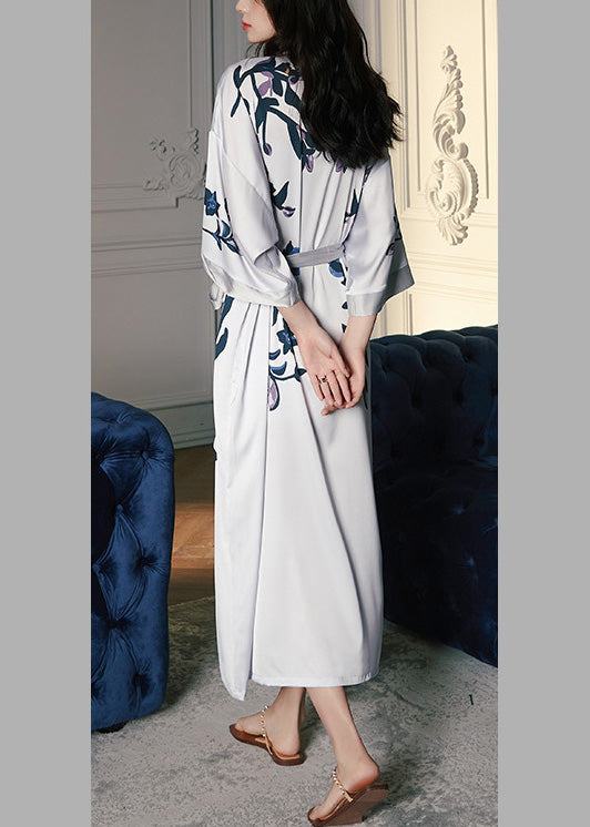 Chic Grey V Neck Print Tie Waist Silk Long Rose Long Sleeve