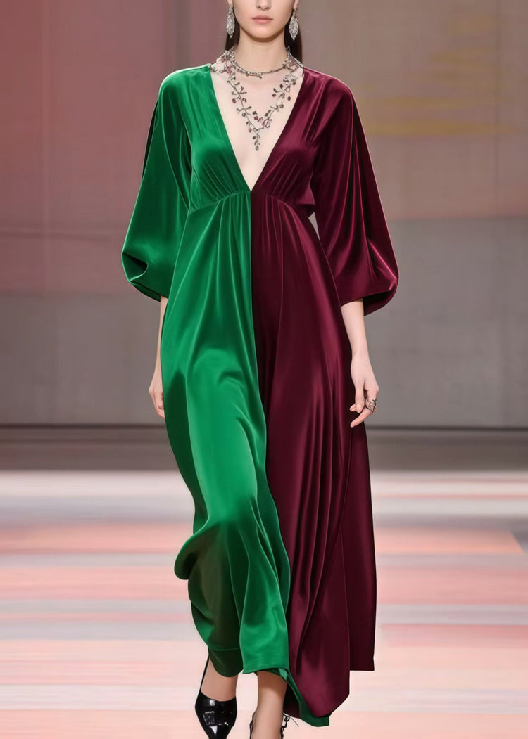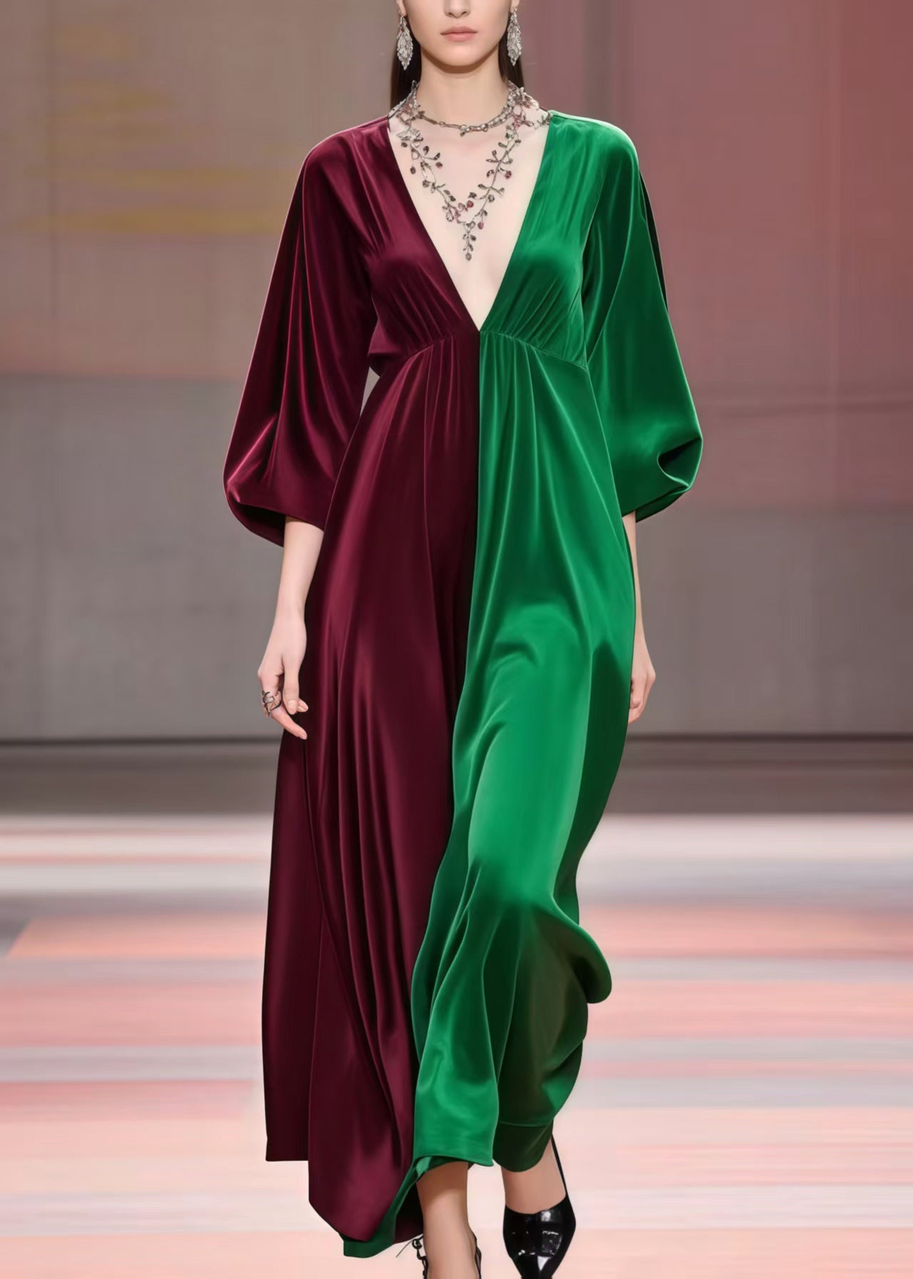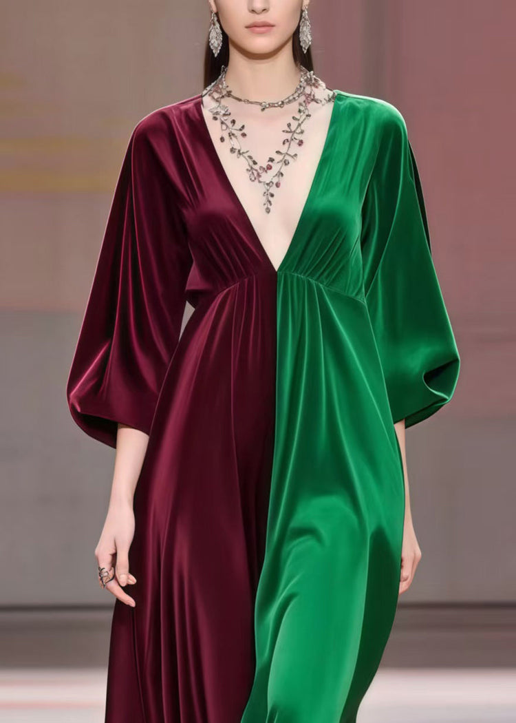Classy Colorblock V Neck Patchwork Silk Dress Bracelet Sleeve