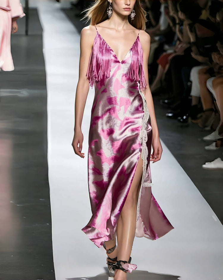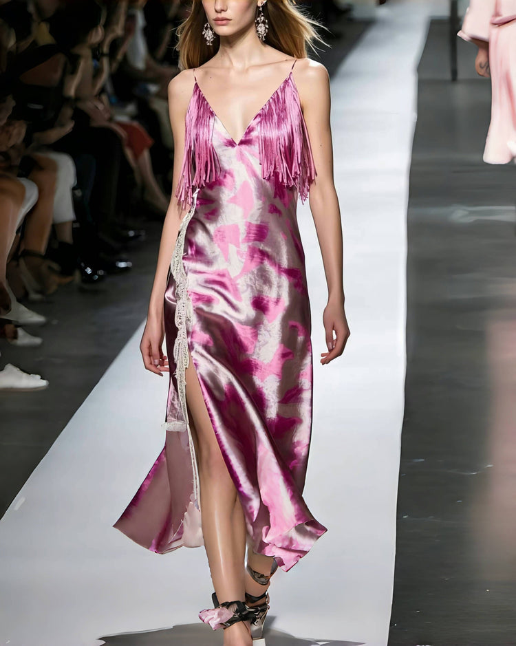 DIY Rose Tasseled Tie Dye Silk Mini Dress Summer
