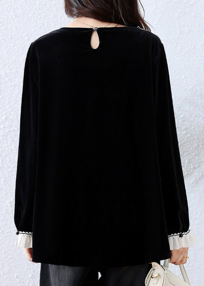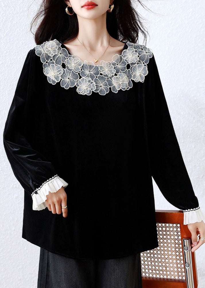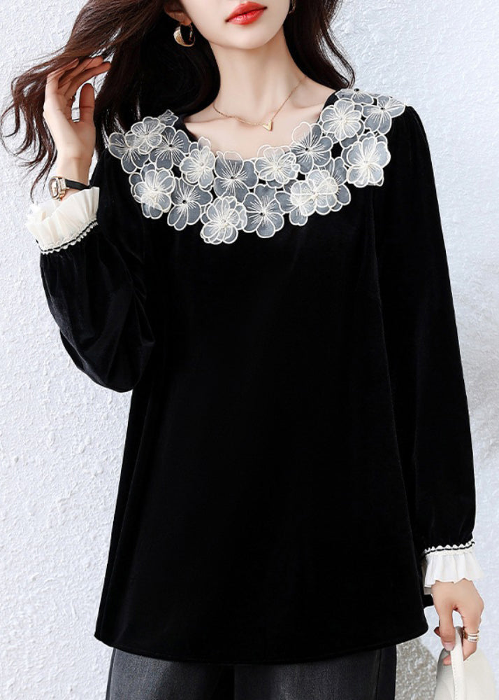 Elegant Black Floral Patchwork Silk Velour T Shirt Fall