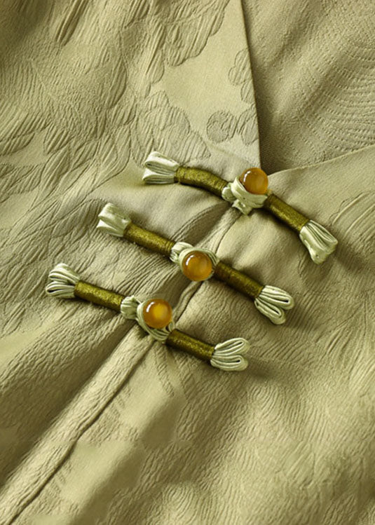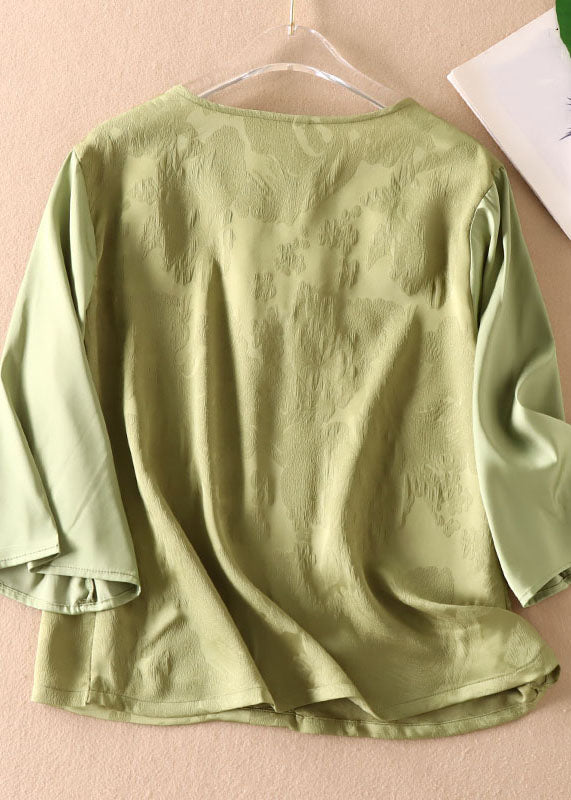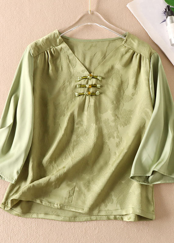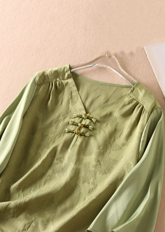 Elegant Green Chinese Jacquard Button Patchwork Silk Shirt Bracelet Sleeve