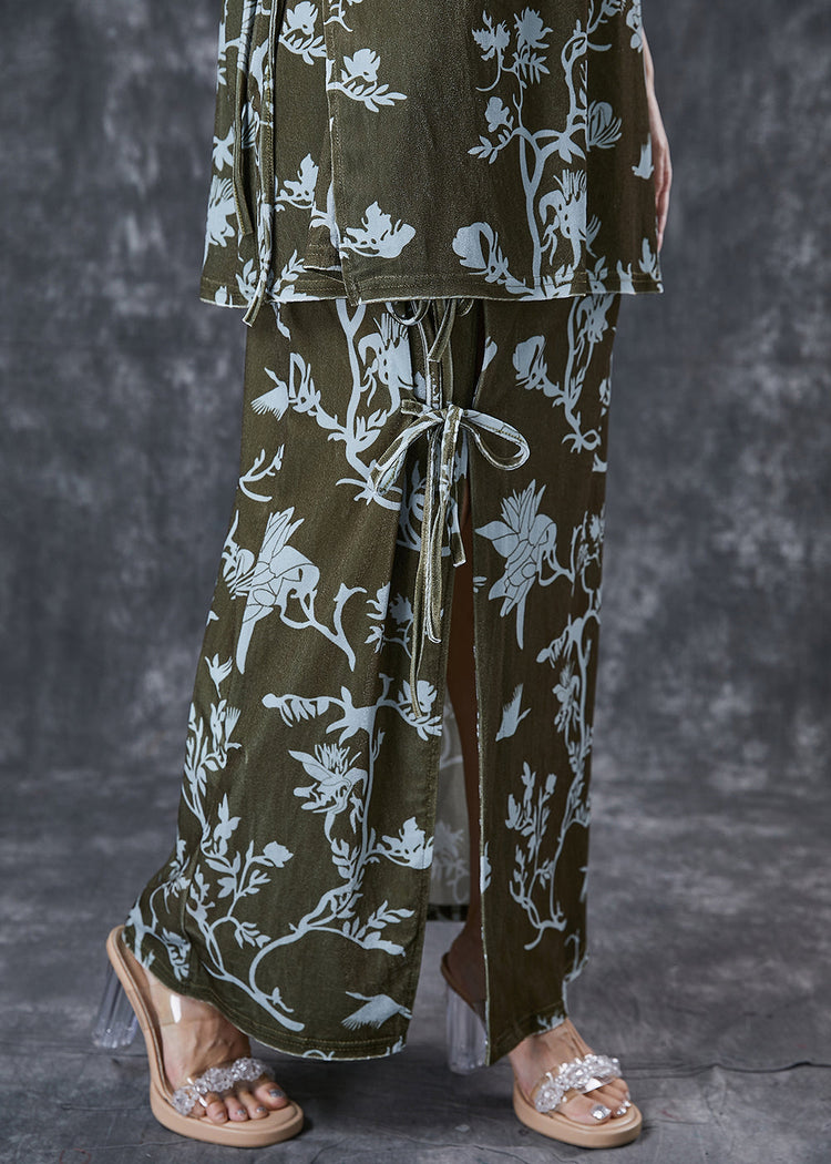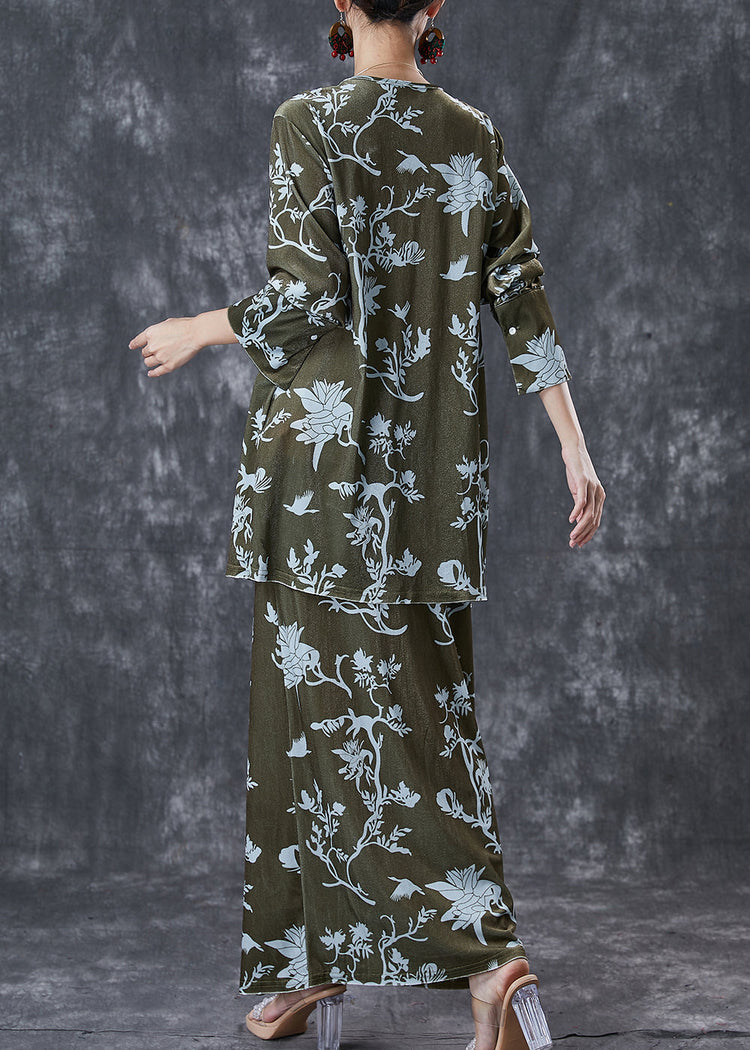 Elegant Green Print Lace Up Side Open Silk Velour Two Pieces Set Spring