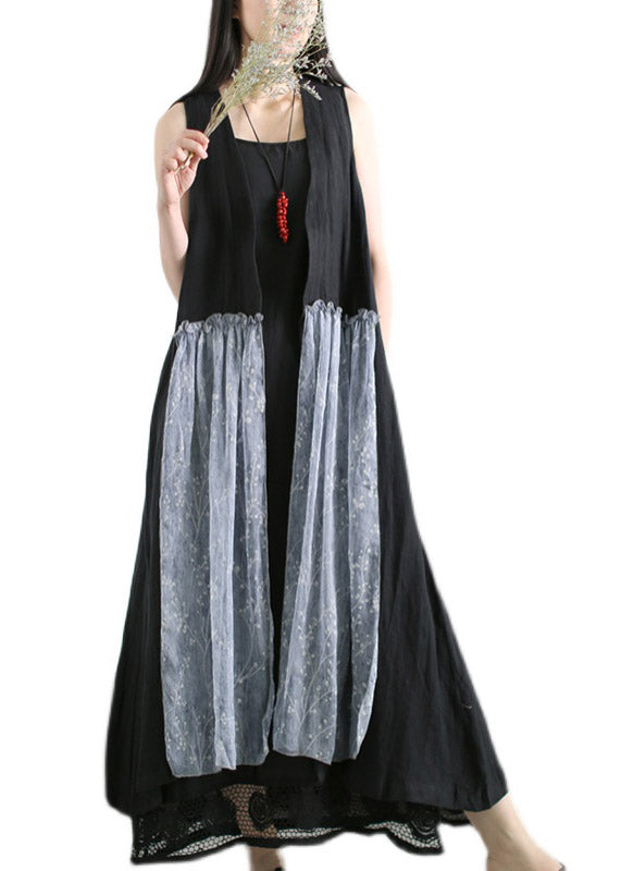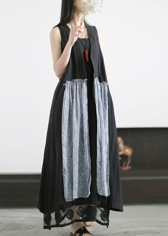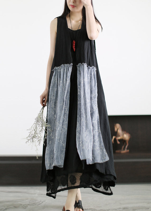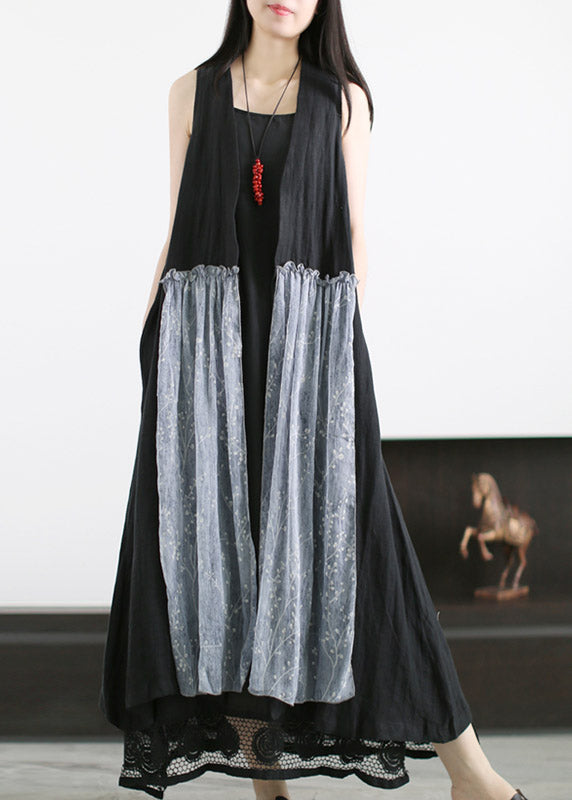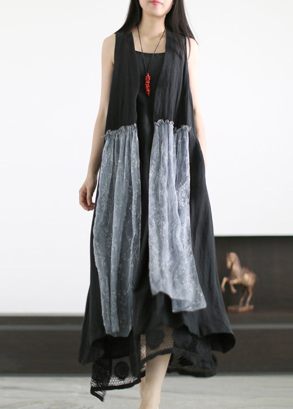 Fashion Black Print Silk Patchwork Linen Waistcoat And Spaghetti Strap Dress Two Piece Set Summer