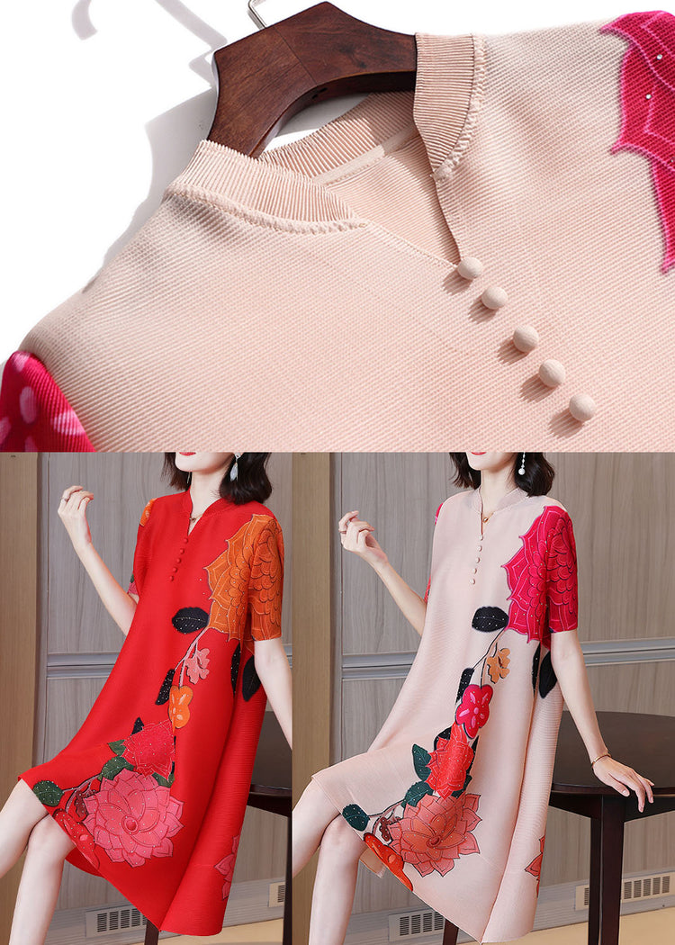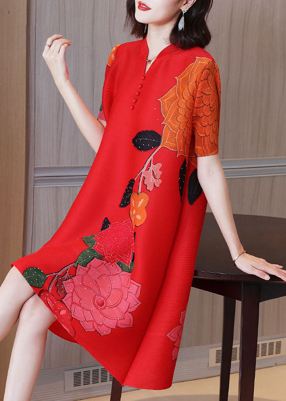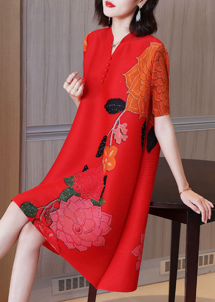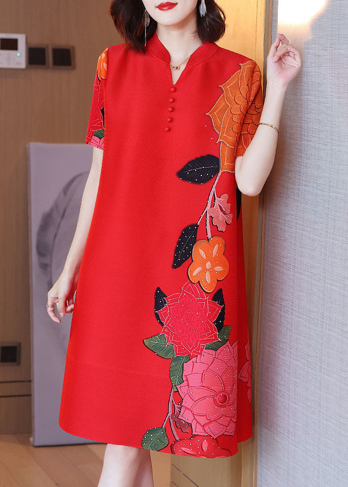 Fashion Red Stand Collar Button Floral Print Wrinkled Silk A Line Dress Short Sleeve