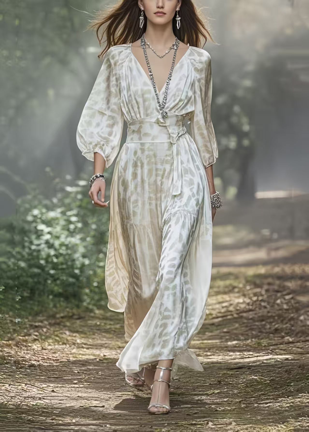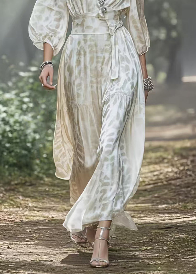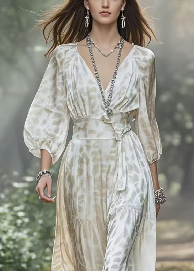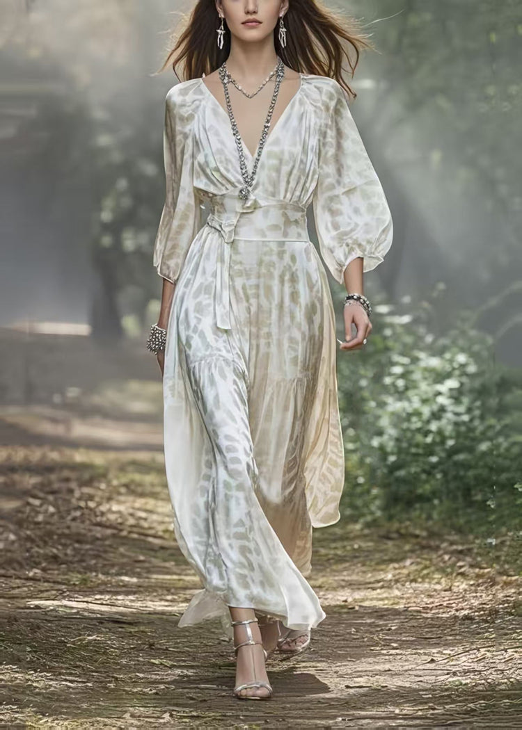 Fashion White V Neck Draping Silk Holiday Dress Lantern Sleeve