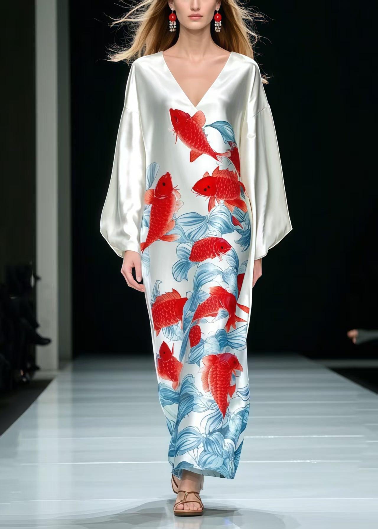 Fine White Oversized Koi Fish Print Silk Dress Spring