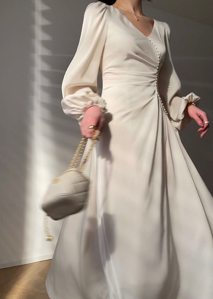 Handmade White V Neck Asymmetrical Design Nail Bead Silk Dress Long Sleeve