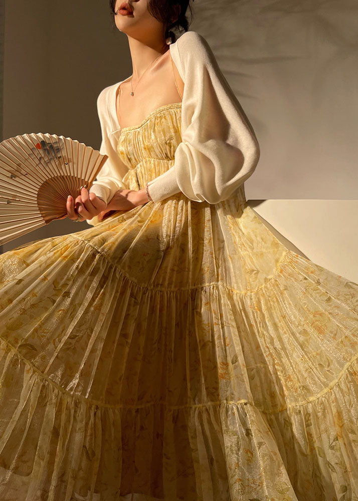 Modern Yellow Print Bustier Patchwork Extra Large Hem Silk Spaghetti Strap Dresses Sleeveless