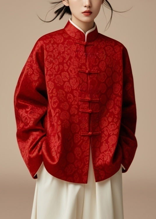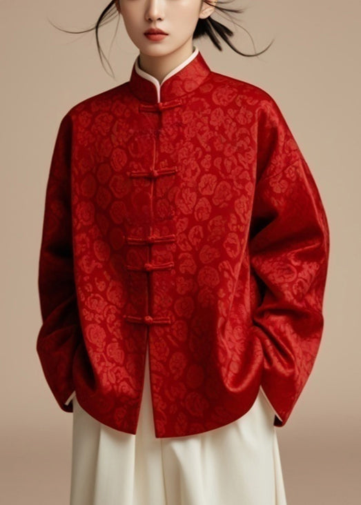 Red Button Print Silk Coat Stand Collar Fall
