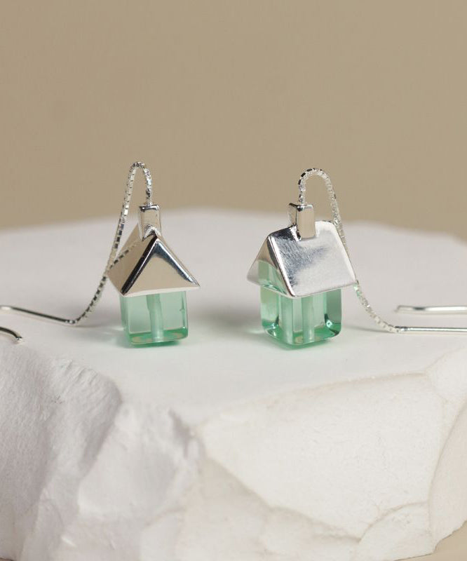 Retro Silk Sterling Silver Overgild Gem Stone Small House Tassel Drop Earrings