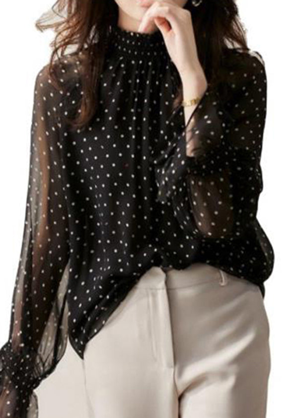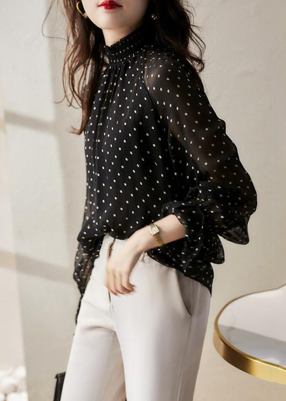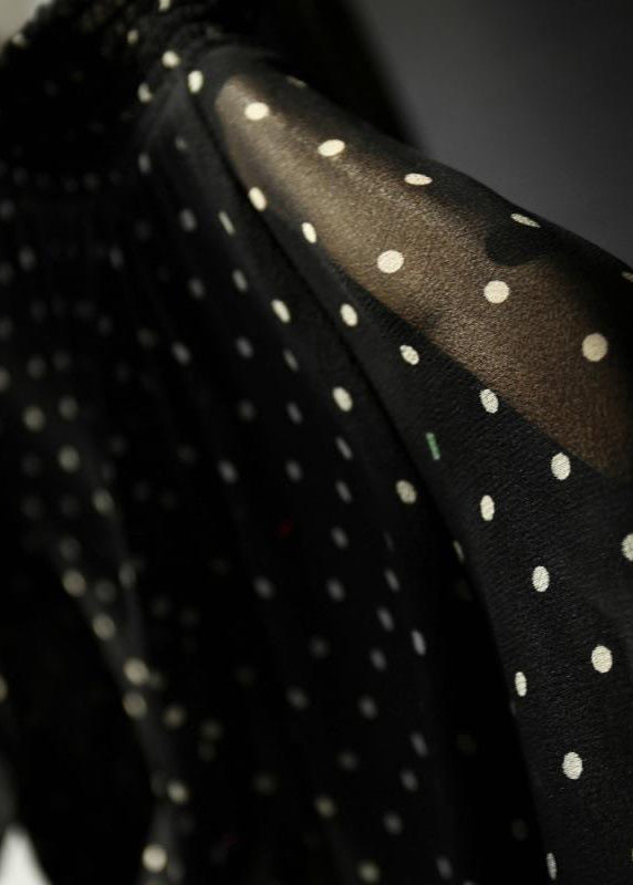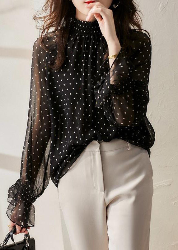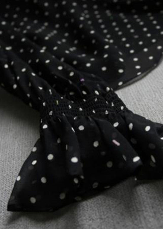 Style Black Ruffled Dot Print Silk Shirts Flare Sleeve
