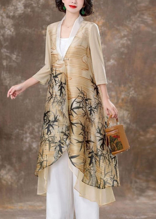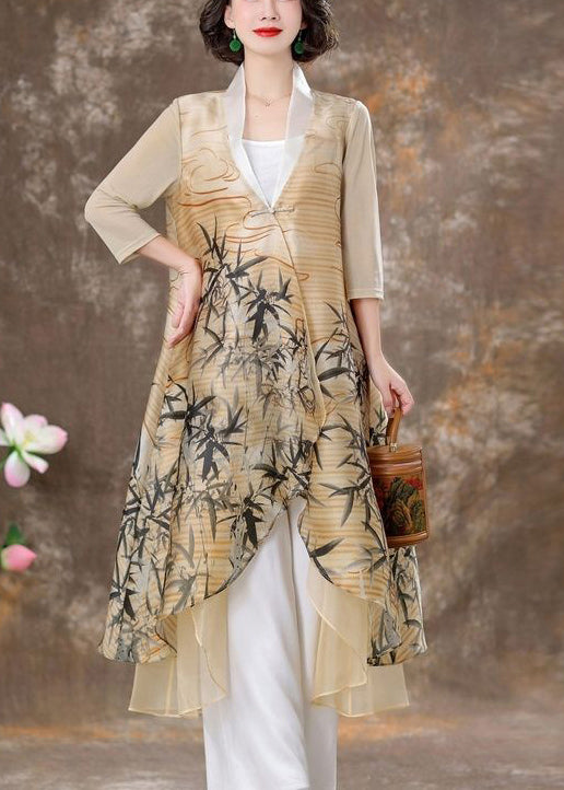 Vintage Apricot Asymmetrical Print Chinese Button Silk Cardigan Fall